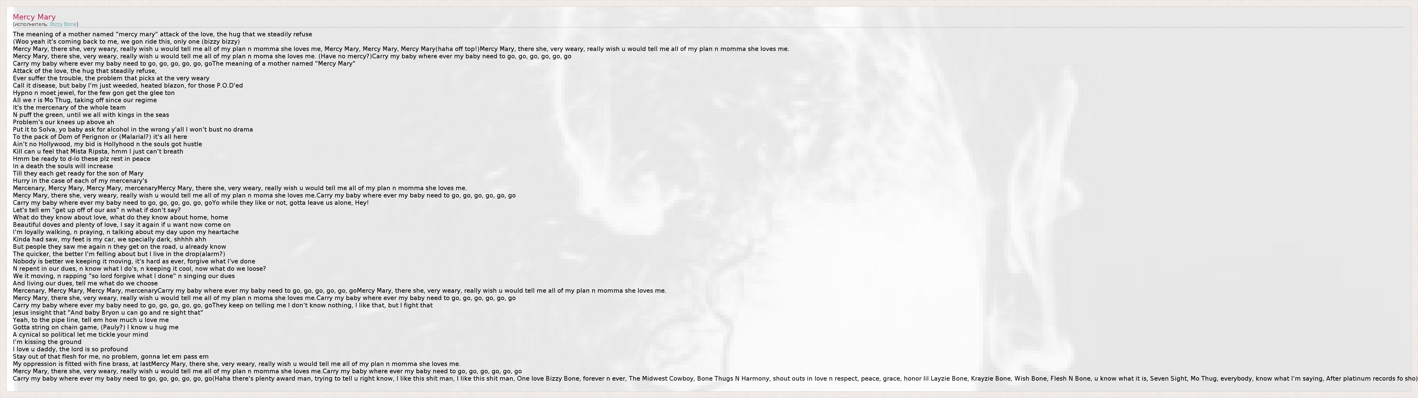 The meaning of a mother named "mercy mary" attack of the love, the hug that we steadily refuse (Woo yeah it's coming back to me, we gon ride this, only one (bizzy bizzy) Mercy Mary, there she, very weary, really wish u would tell me all of my plan n momma she loves me, Mercy Mary, Mercy Mary, Mercy Mary(haha off top!)Mercy Mary, there she, very weary, really wish u would tell me all of my plan n momma she loves me. Mercy Mary, there she, very weary, really wish u would tell me all of my plan n moma she loves me. (Have no mercy?)Carry my baby where ever my baby need to go, go, go, go, go, go Carry my baby where ever my baby need to go, go, go, go, go, goThe meaning of a mother named "Mercy Mary" Attack of the love, the hug that steadily refuse, Ever suffer the trouble, the problem that picks at the very weary Call it disease, but baby I'm just weeded, heated blazon, for those P.O.D'ed Hypno n moet jewel, for the few gon get the glee ton All we r is Mo Thug, taking off since our regime It's the mercenary of the whole team N puff the green, until we all with kings in the seas Problem's our knees up above ah Put it to Solva, yo baby ask for alcohol in the wrong y'all I won't bust no drama To the pack of Dom of Perignon or (Malarial?) it's all here Ain't no Hollywood, my bid is Hollyhood n the souls got hustle Kill can u feel that Mista Ripsta, hmm I just can't breath Hmm be ready to d-lo these plz rest in peace In a death the souls will increase Till they each get ready for the son of Mary Hurry in the case of each of my mercenary's Mercenary, Mercy Mary, Mercy Mary, mercenaryMercy Mary, there she, very weary, really wish u would tell me all of my plan n momma she loves me. Mercy Mary, there she, very weary, really wish u would tell me all of my plan n moma she loves me.Carry my baby where ever my baby need to go, go, go, go, go, go Carry my baby where ever my baby need to go, go, go, go, go, goYo while they like or not, gotta leave us alone, Hey! Let's tell em "get up off of our ass" n what if don't say? What do they know about love, what do they know about home, home Beautiful doves and plenty of love, I say it again if u want now come on I'm loyally walking, n praying, n talking about my day upon my heartache Kinda had saw, my feet is my car, we specially dark, shhhh ahh But people they saw me again n they get on the road, u already know The quicker, the better I'm felling about but I live in the drop(alarm?) Nobody is better we keeping it moving, it's hard as ever, forgive what I've done N repent in our dues, n know what I do's, n keeping it cool, now what do we loose? We it moving, n rapping "so lord forgive what I done" n singing our dues And living our dues, tell me what do we choose Mercenary, Mercy Mary, Mercy Mary, mercenaryCarry my baby where ever my baby need to go, go, go, go, go, goMercy Mary, there she, very weary, really wish u would tell me all of my plan n momma she loves me. Mercy Mary, there she, very weary, really wish u would tell me all of my plan n moma she loves me.Carry my baby where ever my baby need to go, go, go, go, go, go Carry my baby where ever my baby need to go, go, go, go, go, goThey keep on telling me I don't know nothing, I like that, but I fight that Jesus insight that "And baby Bryon u can go and re sight that" Yeah, to the pipe line, tell em how much u love me Gotta string on chain game, (Pauly?) I know u hug me A cynical so political let me tickle your mind I'm kissing the ground I love u daddy, the lord is so profound Stay out of that flesh for me, no problem, gonna let em pass em My oppression is fitted with fine brass, at lastMercy Mary, there she, very weary, really wish u would tell me all of my plan n momma she loves me. Mercy Mary, there she, very weary, really wish u would tell me all of my plan n momma she loves me.Carry my baby where ever my baby need to go, go, go, go, go, go Carry my baby where ever my baby need to go, go, go, go, go, go(Haha there's plenty award man, trying to tell u right know, I like this shit man, I like this shit man, One love Bizzy Bone, forever n ever, The Midwest Cowboy, Bone Thugs N Harmony, shout outs in love n respect, peace, grace, honor lil Layzie Bone, Krayzie Bone, Wish Bone, Flesh N Bone, u know what it is, Seven Sight, Mo Thug, everybody, know what I'm saying, After platinum records fo sho)