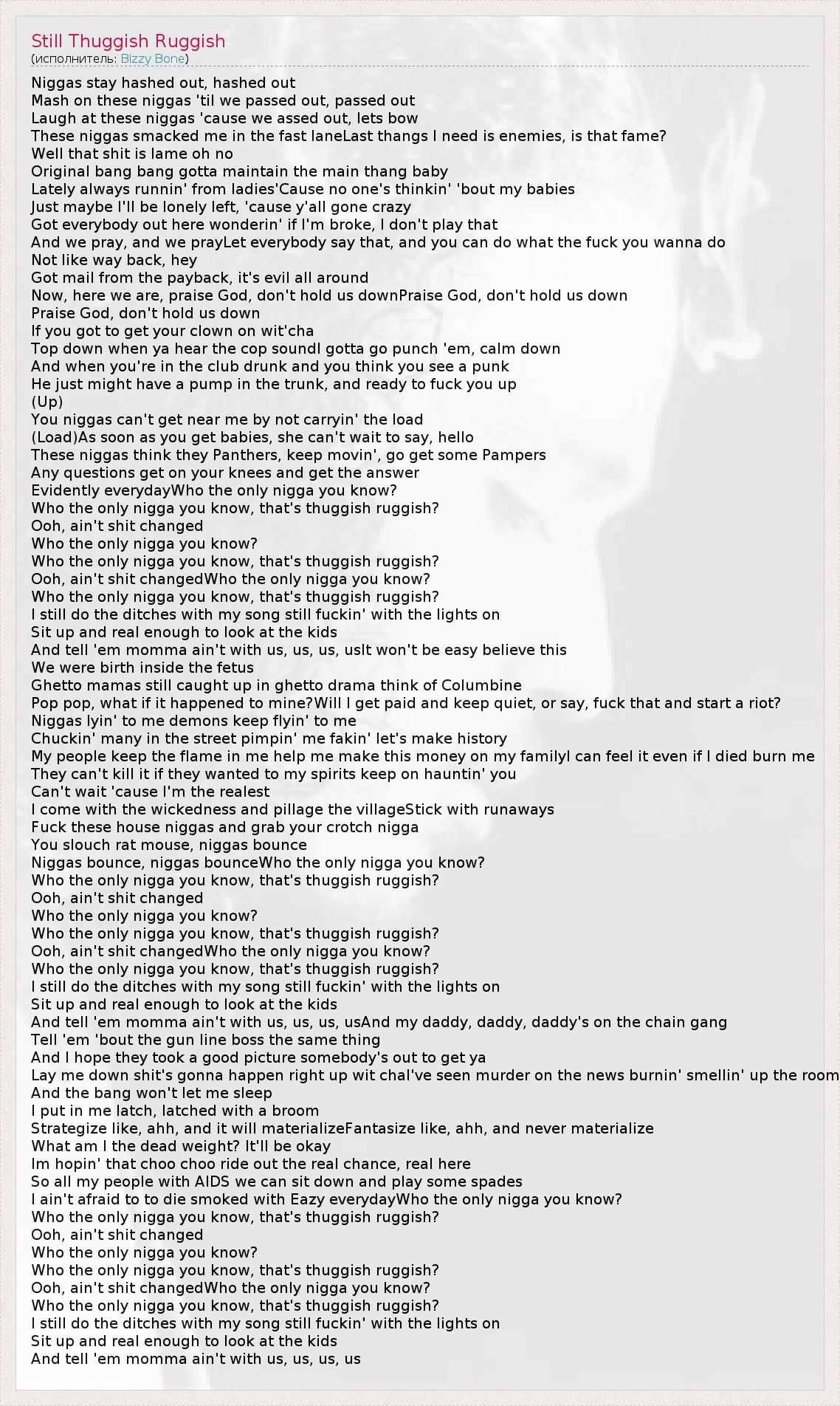 Niggas stay hashed out, hashed out Mash on these niggas 'til we passed out, passed out Laugh at these niggas 'cause we assed out, lets bow These niggas smacked me in the fast laneLast thangs I need is enemies, is that fame? Well that shit is lame oh no Original bang bang gotta maintain the main thang baby Lately always runnin' from ladies'Cause no one's thinkin' 'bout my babies Just maybe I'll be lonely left, 'cause y'all gone crazy Got everybody out here wonderin' if I'm broke, I don't play that And we pray, and we prayLet everybody say that, and you can do what the fuck you wanna do Not like way back, hey Got mail from the payback, it's evil all around Now, here we are, praise God, don't hold us downPraise God, don't hold us down Praise God, don't hold us down If you got to get your clown on wit'cha Top down when ya hear the cop soundI gotta go punch 'em, calm down And when you're in the club drunk and you think you see a punk He just might have a pump in the trunk, and ready to fuck you up (Up) You niggas can't get near me by not carryin' the load (Load)As soon as you get babies, she can't wait to say, hello These niggas think they Panthers, keep movin', go get some Pampers Any questions get on your knees and get the answer Evidently everydayWho the only nigga you know? Who the only nigga you know, that's thuggish ruggish? Ooh, ain't shit changed Who the only nigga you know? Who the only nigga you know, that's thuggish ruggish? Ooh, ain't shit changedWho the only nigga you know? Who the only nigga you know, that's thuggish ruggish? I still do the ditches with my song still fuckin' with the lights on Sit up and real enough to look at the kids And tell 'em momma ain't with us, us, us, usIt won't be easy believe this We were birth inside the fetus Ghetto mamas still caught up in ghetto drama think of Columbine Pop pop, what if it happened to mine?Will I get paid and keep quiet, or say, fuck that and start a riot? Niggas lyin' to me demons keep flyin' to me Chuckin' many in the street pimpin' me fakin' let's make history My people keep the flame in me help me make this money on my familyI can feel it even if I died burn me They can't kill it if they wanted to my spirits keep on hauntin' you Can't wait 'cause I'm the realest I come with the wickedness and pillage the villageStick with runaways Fuck these house niggas and grab your crotch nigga You slouch rat mouse, niggas bounce Niggas bounce, niggas bounceWho the only nigga you know? Who the only nigga you know, that's thuggish ruggish? Ooh, ain't shit changed Who the only nigga you know? Who the only nigga you know, that's thuggish ruggish? Ooh, ain't shit changedWho the only nigga you know? Who the only nigga you know, that's thuggish ruggish? I still do the ditches with my song still fuckin' with the lights on Sit up and real enough to look at the kids And tell 'em momma ain't with us, us, us, usAnd my daddy, daddy, daddy's on the chain gang Tell 'em 'bout the gun line boss the same thing And I hope they took a good picture somebody's out to get ya Lay me down shit's gonna happen right up wit chaI've seen murder on the news burnin' smellin' up the room And the bang won't let me sleep I put in me latch, latched with a broom Strategize like, ahh, and it will materializeFantasize like, ahh, and never materialize What am I the dead weight? It'll be okay Im hopin' that choo choo ride out the real chance, real here So all my people with AIDS we can sit down and play some spades I ain't afraid to to die smoked with Eazy everydayWho the only nigga you know? Who the only nigga you know, that's thuggish ruggish? Ooh, ain't shit changed Who the only nigga you know? Who the only nigga you know, that's thuggish ruggish? Ooh, ain't shit changedWho the only nigga you know? Who the only nigga you know, that's thuggish ruggish? I still do the ditches with my song still fuckin' with the lights on Sit up and real enough to look at the kids And tell 'em momma ain't with us, us, us, us
