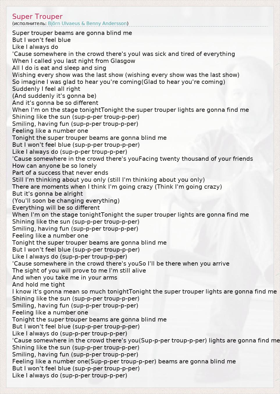 Super trouper beams are gonna blind me But I won't feel blue Like I always do 'Cause somewhere in the crowd there's youI was sick and tired of everything When I called you last night from Glasgow All I do is eat and sleep and sing Wishing every show was the last show (wishing every show was the last show) So imagine I was glad to hear you're coming(Glad to hear you're coming) Suddenly I feel all right (And suddenly it's gonna be) And it's gonna be so different When I'm on the stage tonightTonight the super trouper lights are gonna find me Shining like the sun (sup-p-per troup-p-per) Smiling, having fun (sup-p-per troup-p-per) Feeling like a number one Tonight the super trouper beams are gonna blind me But I won't feel blue (sup-p-per troup-p-per) Like I always do (sup-p-per troup-p-per) 'Cause somewhere in the crowd there's youFacing twenty thousand of your friends How can anyone be so lonely Part of a success that never ends Still I'm thinking about you only (still I'm thinking about you only) There are moments when I think I'm going crazy (Think I'm going crazy) But it's gonna be alright (You'll soon be changing everything) Everything will be so different When I'm on the stage tonightTonight the super trouper lights are gonna find me Shining like the sun (sup-p-per troup-p-per) Smiling, having fun (sup-p-per troup-p-per) Feeling like a number one Tonight the super trouper beams are gonna blind me But I won't feel blue (sup-p-per troup-p-per) Like I always do (sup-p-per troup-p-per) 'Cause somewhere in the crowd there's youSo I'll be there when you arrive The sight of you will prove to me I'm still alive And when you take me in your arms And hold me tight I know it's gonna mean so much tonightTonight the super trouper lights are gonna find me Shining like the sun (sup-p-per troup-p-per) Smiling, having fun (sup-p-per troup-p-per) Feeling like a number one Tonight the super trouper beams are gonna blind me But I won't feel blue (sup-p-per troup-p-per) Like I always do (sup-p-per troup-p-per) 'Cause somewhere in the crowd there's you(Sup-p-per troup-p-per) lights are gonna find me Shining like the sun (sup-p-per troup-p-per) Smiling, having fun (sup-p-per troup-p-per) Feeling like a number one(Sup-p-per troup-p-per) beams are gonna blind me But I won't feel blue (sup-p-per troup-p-per) Like I always do (sup-p-per troup-p-per)