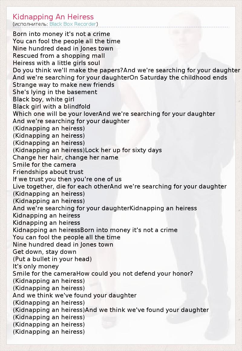 Born into money it's not a crime You can fool the people all the time Nine hundred dead in Jones town Rescued from a shopping mall Heiress with a little girls soul Do you think we'll make the papers?And we're searching for your daughter And we're searching for your daughterOn Saturday the childhood ends Strange way to make new friends She's lying in the basement Black boy, white girl Black girl with a blindfold Which one will be your loverAnd we're searching for your daughter And we're searching for your daughter (Kidnapping an heiress) (Kidnapping an heiress) (Kidnapping an heiress) (Kidnapping an heiress)Lock her up for sixty days Change her hair, change her name Smile for the camera Friendships about trust If we trust you then you're one of us Live together, die for each otherAnd we're searching for your daughter (Kidnapping an heiress) (Kidnapping an heiress) And we're searching for your daughterKidnapping an heiress Kidnapping an heiress Kidnapping an heiress Kidnapping an heiressBorn into money it's not a crime You can fool the people all the time Nine hundred dead in Jones town Get down, stay down (Put a bullet in your head) It's only money Smile for the cameraHow could you not defend your honor? (Kidnapping an heiress) (Kidnapping an heiress) And we think we've found your daughter (Kidnapping an heiress) (Kidnapping an heiress)And we think we've found your daughter (Kidnapping an heiress) (Kidnapping an heiress) (Kidnapping an heiress)