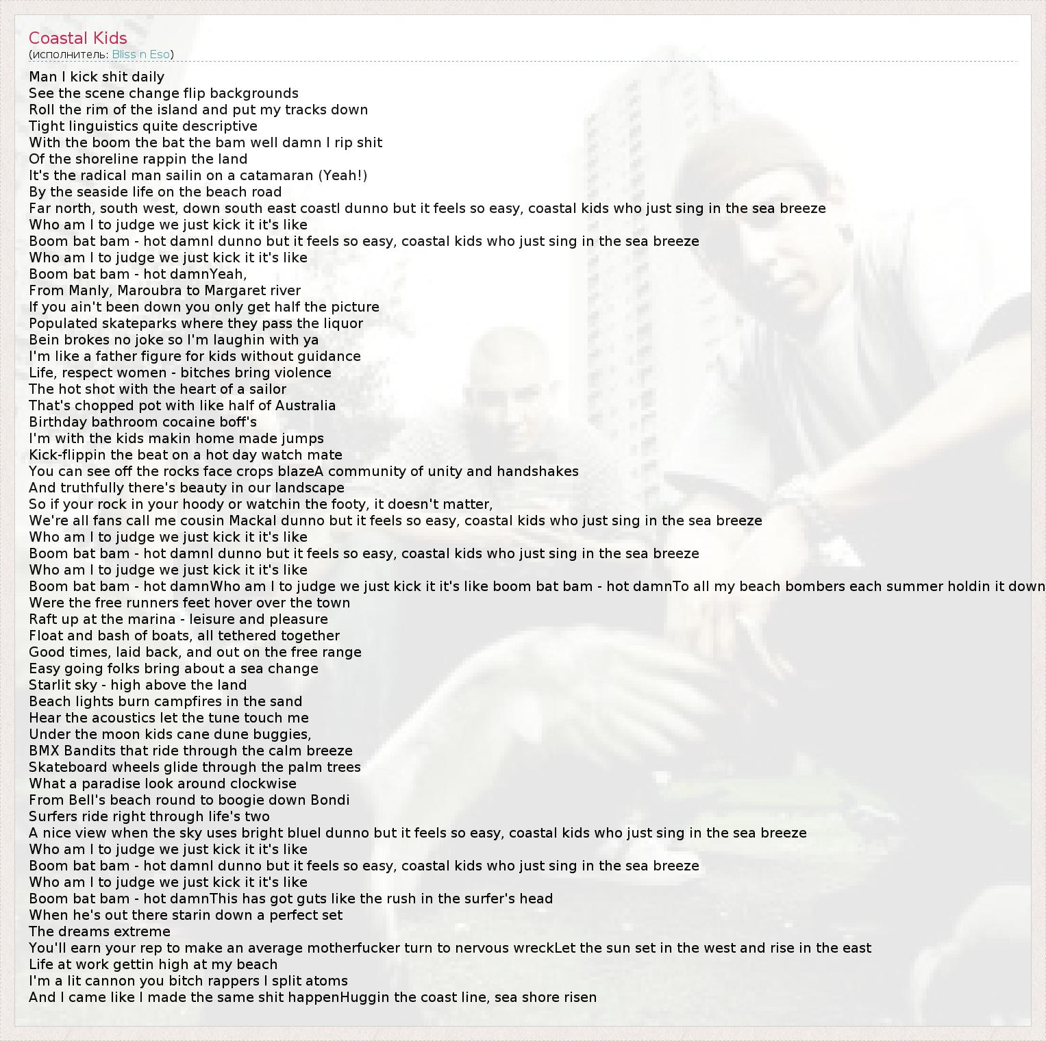 Boom bat bam - hot damnWho am I to judge we just kick it it's like boom bat bam - hot damnTo all my beach bombers each summer holdin it down