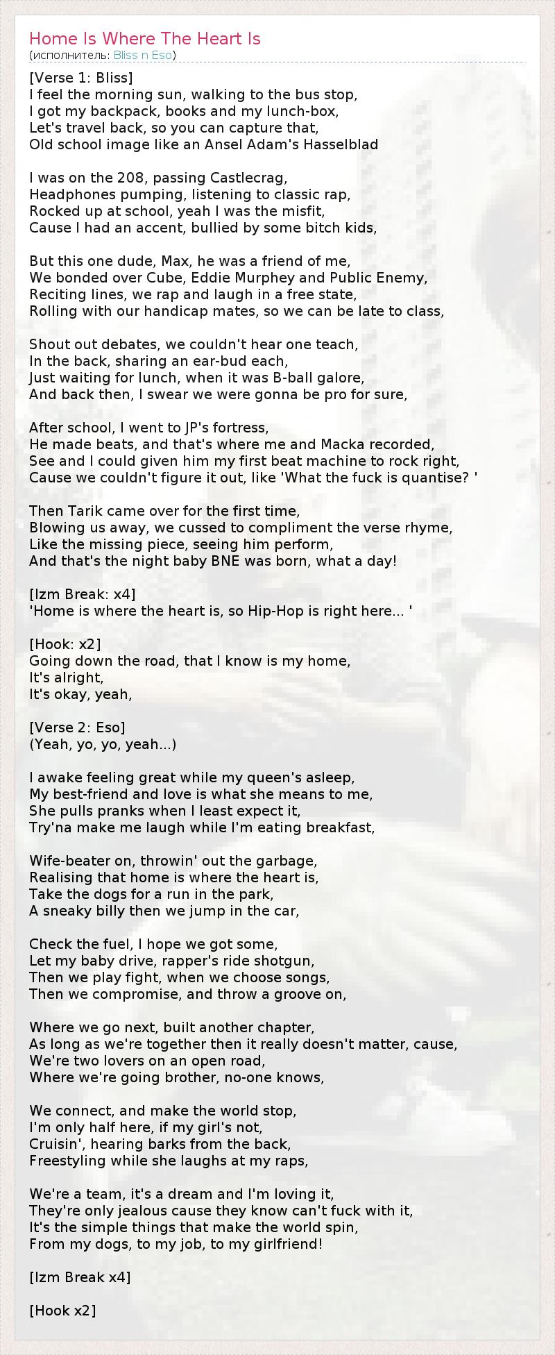 [ Стих 1 : Bliss ] Я чувствую, утреннее солнце , прогулки к автобусной остановке , Я получил свой рюкзак , книги и мой ланч-бокс , Давайте путешествовать , поэтому вы можете захватить , что , Старая школа изображение как Hasselblad давал Анселя Адама Я был на 208 , проходя Castlecrag , Наушники насосные , слушая классическую рэп , Качались в школе , да я был неудачником , Потому что я был акцент , издеваются некоторыми сука детей , Но этот чувак , Макс, он был другом мне , Мы связаны по Cube , Эдди Мерфи и Public Enemy , Чтение строки , мы рэп и смеяться в свободном состоянии , Подвижной с нашими комнатами товарищей , так что мы можем опоздать на занятия , Выкрикните дебаты , мы не могли услышать одну учить , В задней части, разделяя Наушники-вкладыши каждый , Просто ждет обед , когда он был B- мяч в изобилии, И тогда , я клянусь, что мы собирались быть про наверняка, После школы я пошел к крепости JP автора , Он сделал ударов , а вот где я и Macka записаны , Смотрите , и я мог дать ему свою первую бить машину раскачивать право , Потому что мы не могли понять его , как " Что ебать это квантовать ? ' Тогда Тарик подошел впервые , Дуя нас далеко , мы упрямый , чтобы хвалить стих рифму , Как пропавших кусок , видя , что он выступает , И вот в ночь ребенок BNE родился , какой день ! [ Izm Перерыв : x4 ] " Дом там, где сердце , поэтому Хип-Хоп прямо здесь ... " [Припев : x2] Спускаясь вниз по дороге , что я знаю, это мой дом , Все в порядке, Все в порядке, да, [Куплет 2 : Eso ] ( Да, йо, йо , да ... ) Я просыпаюсь чувствую себя великолепно во время сна моего королевы, Мой лучший - друг и любовь , что она значит для меня , Она тянет шалости , когда я меньше всего этого ожидаете , Try'na смеши меня , пока я ел завтрак , Жена для взбивания на , вбрасывания ' мусор , Понимая, что дом там, где сердце есть, Возьмите собак для бега в парке , Подлый Билли тогда мы прыгать в машину , Проверить топливо , я надеюсь, мы получили некоторые , Пусть мой ребенок езды , езды дробовик рэпера , Тогда мы играем бой, когда мы выбираем песни , Тогда мы на компромисс, и бросить паз на , Куда мы идем рядом , построенный еще одну главу , Пока мы вместе , то это действительно не имеет значения , потому что , Мы два влюбленных на открытой дороге , Куда мы идем брата , никто не знает , Мы связываем , и сделать мир остановку , Я только наполовину здесь , если моя девушка не так, Cruisin ' , услышав лай со спины, Freestyling то время как она смеется над моими рапса , Мы команда , это мечта и я люблю его , Они только ревнует , потому что они знают, не могут трахаться с ним , Это простые вещи , которые делают мир спина , Из моих собак , с моей работой , моей подруге ! [ Izm Перерыв x4] [Припев х2]