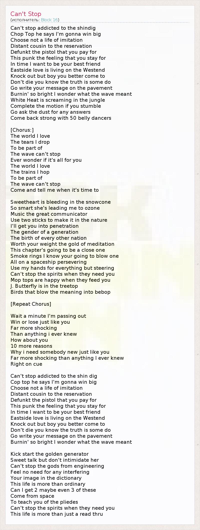 Can't stop addicted to the shindig Chop Top he says I'm gonna win big Choose not a life of imitation Distant cousin to the reservation Defunkt the pistol that you pay for This punk the feeling that you stay for In time I want to be your best friend Eastside love is living on the Westend Knock out but boy you better come to Don't die you know the truth is some do Go write your message on the pavement Burnin' so bright I wonder what the wave meant White Heat is screaming in the jungle Complete the motion if you stumble Go ask the dust for any answers Come back strong with 50 belly dancers [Chorus:] The world I love The tears I drop To be part of The wave can't stop Ever wonder if it's all for you The world I love The trains I hop To be part of The wave can't stop Come and tell me when it's time to Sweetheart is bleeding in the snowcone So smart she's leading me to ozone Music the great communicator Use two sticks to make it in the nature I'll get you into penetration The gender of a generation The birth of every other nation Worth your weight the gold of meditation This chapter's going to be a close one Smoke rings I know your going to blow one All on a spaceship persevering Use my hands for everything but steering Can't stop the spirits when they need you Mop tops are happy when they feed you J. Butterfly is in the treetop Birds that blow the meaning into bebop [Repeat Chorus] Wait a minute I'm passing out Win or lose just like you Far more shocking Than anything i ever knew How about you 10 more reasons Why i need somebody new just like you Far more shocking than anything I ever knew Right on cue Can't stop addicted to the shin dig Cop top he says I'm gonna win big Choose not a life of imitation Distant cousin to the reservation Defunkt the pistol that you pay for This punk the feeling that you stay for In time I want to be your best friend Eastside love is living on the Westend Knock out but boy you better come to Don't die you know the truth is some do Go write your message on the pavement Burnin' so bright I wonder what the wave meant Kick start the golden generator Sweet talk but don't intimidate her Can't stop the gods from engineering Feel no need for any interfering Your image in the dictionary This life is more than ordinary Can I get 2 maybe even 3 of these Come from space To teach you of the pliedes Can't stop the spirits when they need you This life is more than just a read thru