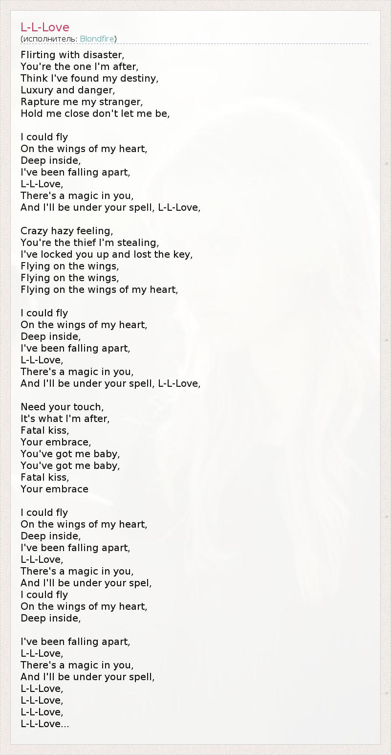 Flirting with disaster, You're the one I'm after, Think I've found my destiny, Luxury and danger, Rapture me my stranger, Hold me close don't let me be, I could fly On the wings of my heart, Deep inside, I've been falling apart, L-L-Love, There's a magic in you, And I'll be under your spell, L-L-Love, Crazy hazy feeling, You're the thief I'm stealing, I've locked you up and lost the key, Flying on the wings, Flying on the wings, Flying on the wings of my heart, I could fly On the wings of my heart, Deep inside, I've been falling apart, L-L-Love, There's a magic in you, And I'll be under your spell, L-L-Love, Need your touch, It's what I'm after, Fatal kiss, Your embrace, You've got me baby, You've got me baby, Fatal kiss, Your embrace I could fly On the wings of my heart, Deep inside, I've been falling apart, L-L-Love, There's a magic in you, And I'll be under your spel, I could fly On the wings of my heart, Deep inside, I've been falling apart, L-L-Love, There's a magic in you, And I'll be under your spell, L-L-Love, L-L-Love, L-L-Love, L-L-Love...