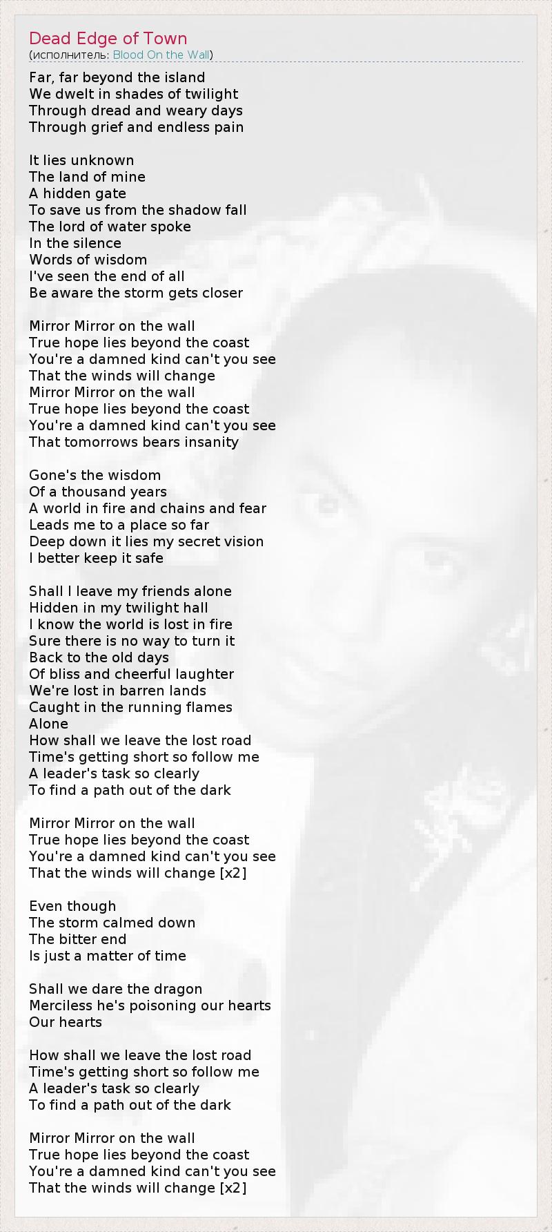 Далеко, далеко за островом В сумеречных тенях мы проживаем Ужасные и утомительные дни, Наполненные горем и нескончаемой болью. Моя земля Лежит в неизвестности, Тайные врата, Чтобы спасти нас от наступления теней. Повелитель воды произносил В тишине Мудрые слова: "Я видел конец всего. Знайте, приближается буря." Свет мой, зеркальце, на стене, Истинная надежда - за пределами побережья. Вы - проклятое племя, разве вы не понимаете, Что ветер переменится. Свет мой, зеркальце, на стене, Истинная надежда - за пределами побережья. Вы - проклятое племя, разве вы не понимаете, Что завтрашний день принесет безумие. Тысячелетняя мудрость Пропала. Мир в огне, цепях и страхе Ведет меня к такому далекому месту. Оно находится глубоко внизу, мое тайное видение, Лучше мне хранить его в безопасности. Следует ли мне оставить моих друзей одних, Спрятанными в моем сумеречном зале? Я знаю, мир потерян в огне. Уверен, что нет пути, чтобы вернуть Прежние времена Блаженства и радостного смеха. Мы потеряны в бесплодных землях, Захвачены бегущими языками пламени, Мы одиноки. Как же нам оставить эту потерянную дорогу? Времени выходит, так что следуйте за мной. Задача вожака так ясна - Найти тропу из темноты. Свет мой, зеркальце, на стене, Истинная надежда - за пределами побережья. Вы - проклятое племя, разве вы не понимаете, Что ветер переменится? [x2] Если даже Буря утихнет, Печальный конец - Это лишь вопрос времени. Бросить ли нам вызов дракону? Он, не знающий пощады, отравляет наши сердца, Наши сердца. Как же нам оставить эту потерянную дорогу? Времени выходит, так что следуйте за мной. Задача вожака так ясна - Найти тропу из темноты. Свет мой, зеркальце, на стене, Истинная надежда - за пределами побережья. Вы - проклятое племя, разве вы не понимаете, Что ветер переменится? [x2]
