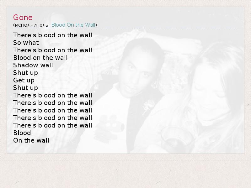 There's blood on the wall So what There's blood on the wall Blood on the wall Shadow wall Shut up Get up Shut up There's blood on the wall There's blood on the wall There's blood on the wall There's blood on the wall There's blood on the wall Blood On the wall