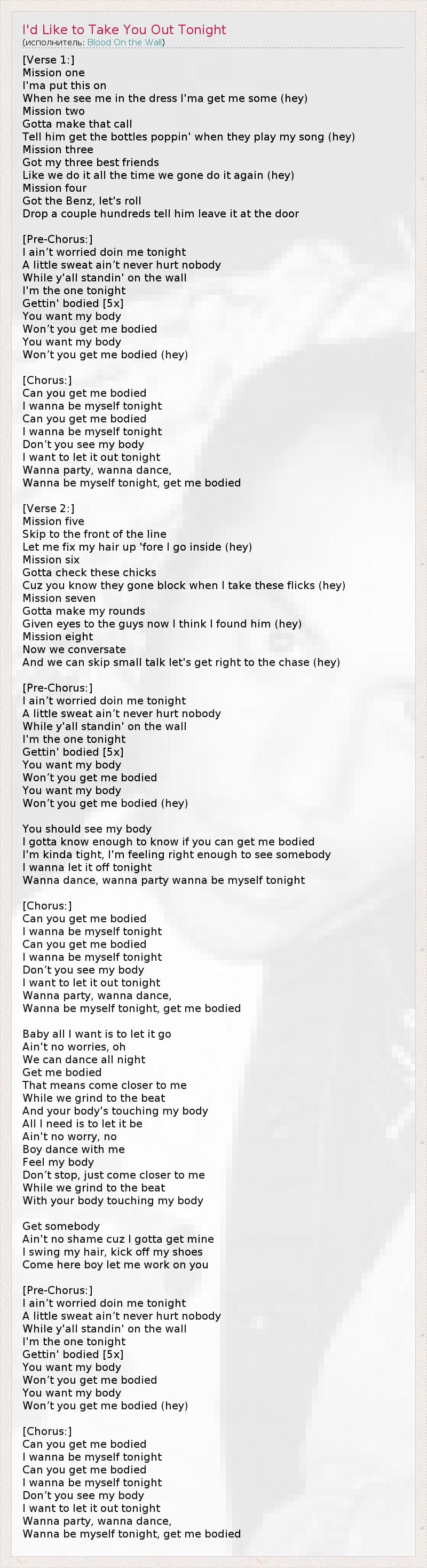 [Verse 1:] Mission one I'ma put this on When he see me in the dress I'ma get me some (hey) Mission two Gotta make that call Tell him get the bottles poppin' when they play my song (hey) Mission three Got my three best friends Like we do it all the time we gone do it again (hey) Mission four Got the Benz, let's roll Drop a couple hundreds tell him leave it at the door [Pre-Chorus:] I ain’t worried doin me tonight A little sweat ain’t never hurt nobody While y'all standin' on the wall I'm the one tonight Gettin' bodied [5x] You want my body Won’t you get me bodied You want my body Won’t you get me bodied (hey) [Chorus:] Can you get me bodied I wanna be myself tonight Can you get me bodied I wanna be myself tonight Don’t you see my body I want to let it out tonight Wanna party, wanna dance, Wanna be myself tonight, get me bodied [Verse 2:] Mission five Skip to the front of the line Let me fix my hair up 'fore I go inside (hey) Mission six Gotta check these chicks Cuz you know they gone block when I take these flicks (hey) Mission seven Gotta make my rounds Given eyes to the guys now I think I found him (hey) Mission eight Now we conversate And we can skip small talk let's get right to the chase (hey) [Pre-Chorus:] I ain’t worried doin me tonight A little sweat ain’t never hurt nobody While y'all standin' on the wall I'm the one tonight Gettin' bodied [5x] You want my body Won’t you get me bodied You want my body Won’t you get me bodied (hey) You should see my body I gotta know enough to know if you can get me bodied I'm kinda tight, I'm feeling right enough to see somebody I wanna let it off tonight Wanna dance, wanna party wanna be myself tonight [Chorus:] Can you get me bodied I wanna be myself tonight Can you get me bodied I wanna be myself tonight Don’t you see my body I want to let it out tonight Wanna party, wanna dance, Wanna be myself tonight, get me bodied Baby all I want is to let it go Ain't no worries, oh We can dance all night Get me bodied That means come closer to me While we grind to the beat And your body's touching my body All I need is to let it be Ain't no worry, no Boy dance with me Feel my body Don’t stop, just come closer to me While we grind to the beat With your body touching my body Get somebody Ain't no shame cuz I gotta get mine I swing my hair, kick off my shoes Come here boy let me work on you [Pre-Chorus:] I ain’t worried doin me tonight A little sweat ain’t never hurt nobody While y'all standin' on the wall I'm the one tonight Gettin' bodied [5x] You want my body Won’t you get me bodied You want my body Won’t you get me bodied (hey) [Chorus:] Can you get me bodied I wanna be myself tonight Can you get me bodied I wanna be myself tonight Don’t you see my body I want to let it out tonight Wanna party, wanna dance, Wanna be myself tonight, get me bodied