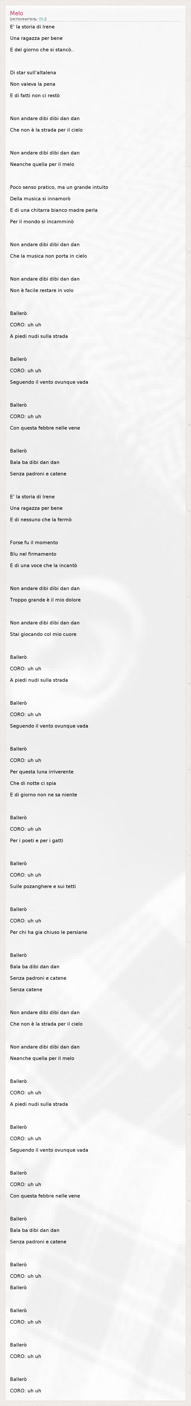E' la storia di Irene Una ragazza per bene E del giorno che si stancò.. Di star sull'altalena Non valeva la pena E di fatti non ci restò Non andare dibi dibi dan dan Che non è la strada per il cielo Non andare dibi dibi dan dan Neanche quella per il melo Poco senso pratico, ma un grande intuito Della musica si innamorò E di una chitarra bianco madre perla Per il mondo si incamminò Non andare dibi dibi dan dan Che la musica non porta in cielo Non andare dibi dibi dan dan Non è facile restare in volo Ballerò CORO: uh uh A piedi nudi sulla strada Ballerò CORO: uh uh Seguendo il vento ovunque vada Ballerò CORO: uh uh Con questa febbre nelle vene Ballerò Bala ba dibi dan dan Senza padroni e catene E' la storia di Irene Una ragazza per bene E di nessuno che la fermò Forse fu il momento Blu nel firmamento E di una voce che la incantò Non andare dibi dibi dan dan Troppo grande è il mio dolore Non andare dibi dibi dan dan Stai giocando col mio cuore Ballerò CORO: uh uh A piedi nudi sulla strada Ballerò CORO: uh uh Seguendo il vento ovunque vada Ballerò CORO: uh uh Per questa luna irriverente Che di notte ci spia E di giorno non ne sa niente Ballerò CORO: uh uh Per i poeti e per i gatti Ballerò CORO: uh uh Sulle pozanghere e sui tetti Ballerò CORO: uh uh Per chi ha gia chiuso le persiane Ballerò Bala ba dibi dan dan Senza padroni e catene Senza catene Non andare dibi dibi dan dan Che non è la strada per il cielo Non andare dibi dibi dan dan Neanche quella per il melo Ballerò CORO: uh uh A piedi nudi sulla strada Ballerò CORO: uh uh Seguendo il vento ovunque vada Ballerò CORO: uh uh Con questa febbre nelle vene Ballerò Bala ba dibi dan dan Senza padroni e catene Ballerò CORO: uh uh Ballerò Ballerò CORO: uh uh Ballerò CORO: uh uh Ballerò CORO: uh uh