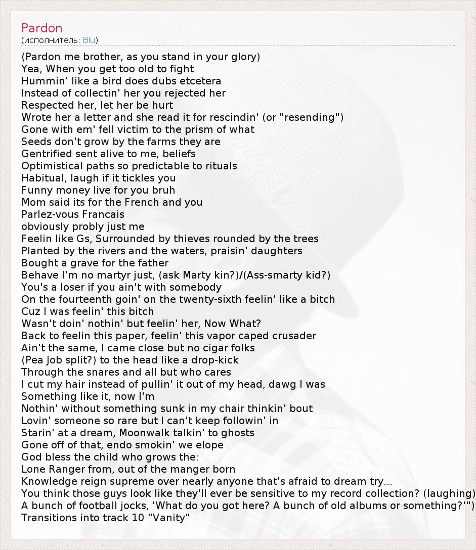 (Pardon me brother, as you stand in your glory) Yea, When you get too old to fight Hummin' like a bird does dubs etcetera Instead of collectin' her you rejected her Respected her, let her be hurt Wrote her a letter and she read it for rescindin' (or "resending") Gone with em' fell victim to the prism of what Seeds don't grow by the farms they are Gentrified sent alive to me, beliefs Optimistical paths so predictable to rituals Habitual, laugh if it tickles you Funny money live for you bruh Mom said its for the French and you Parlez-vous Francais obviously probly just me Feelin like Gs, Surrounded by thieves rounded by the trees Planted by the rivers and the waters, praisin' daughters Bought a grave for the father Behave I'm no martyr just, (ask Marty kin?)/(Ass-smarty kid?) You's a loser if you ain't with somebody On the fourteenth goin' on the twenty-sixth feelin' like a bitch Cuz I was feelin' this bitch Wasn't doin' nothin' but feelin' her, Now What? Back to feelin this paper, feelin' this vapor caped crusader Ain't the same, I came close but no cigar folks (Pea Job split?) to the head like a drop-kick Through the snares and all but who cares I cut my hair instead of pullin' it out of my head, dawg I was Something like it, now I'm Nothin' without something sunk in my chair thinkin' bout Lovin' someone so rare but I can't keep followin' in Starin' at a dream, Moonwalk talkin' to ghosts Gone off of that, endo smokin' we elope God bless the child who grows the: Lone Ranger from, out of the manger born Knowledge reign supreme over nearly anyone that's afraid to dream try... You think those guys look like they'll ever be sensitive to my record collection? (laughing) A bunch of football jocks, 'What do you got here? A bunch of old albums or something?'") Transitions into track 10 "Vanity"