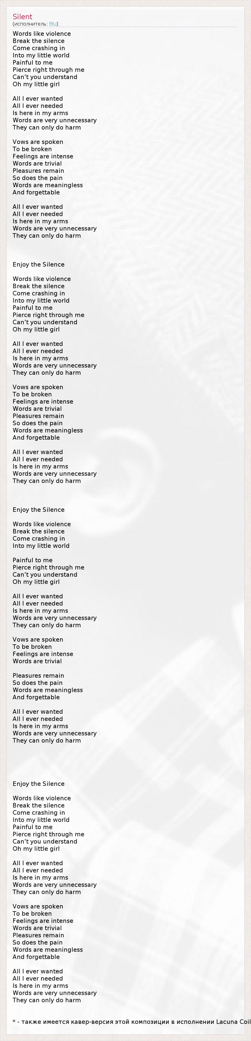 * - также имеется кавер-версия этой композиции в исполнении Lacuna Coil