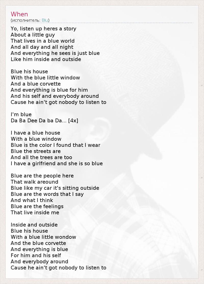 Слушайте, вот вам история О маленьком пареньке, Живущем в синем (унылом) мире И весь день, и всю ночь, И все, что он видит - только синее, Как он сам - внутри и снаружи. Синего цвета его дом С небольшим синим окошком, И синий Корвет**, И все синее для него - И он сам, и все, кто вокруг, Потому что ему некого слушать. Я подавлен, Да ба ди Да ба да...[4x] У меня есть синий дом, С синим окном. Синий - это цвет, который я нашел и который ношу. Синие улицы И деревья тоже, У меня есть девушка, и она такая унылая. Подавлены люди, Что гуляют вокруг, Как моя синяя машина, что стоит на улице. Унылы слова, которыми я говорю И думаю, Унылы чувства, Что живут внутри меня. Внутри и снаружи Синий его дом С небольшим синим окошком, И синий Корвет И все синее для него... И он сам, И все вокруг, Потому что ему некого слушать. * Игра слов: Blue переводится с англ.яз. как "синий" и "унылый, подавленный, в депрессии" ** Шевроле Корвет