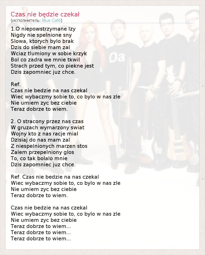 1.O niepowstrzymane lzy Nigdy nie spelnione sny Slowa, ktorych bylo brak Dzis do siebie mam zal Wciaz tlumiony w sobie krzyk Bol co zadra we mnie tkwil Strach przed tym, co piekne jest Dzis zapomniec juz chce. Ref. Czas nie bedzie na nas czekal Wiec wybaczmy sobie to, co bylo w nas zle Nie umiem zyc bez ciebie Teraz dobrze to wiem. 2. O stracony przez nas czas W gruzach wymarzony swiat Wojny kto z nas racje mial Dzisiaj do nas mam zal Z niespelnionych marzen stos Zalem przepelniony glos To, co tak bolalo mnie Dzis zapomniec juz chce. Ref. Czas nie bedzie na nas czekal Wiec wybaczmy sobie to, co bylo w nas zle Nie umiem zyc bez ciebie Teraz dobrze to wiem. Czas nie bedzie na nas czekal Wiec wybaczmy sobie to, co bylo w nas zle Nie umiem zyc bez ciebie Teraz dobrze to wiem... Teraz dobrze to wiem... Teraz dobrze to wiem...