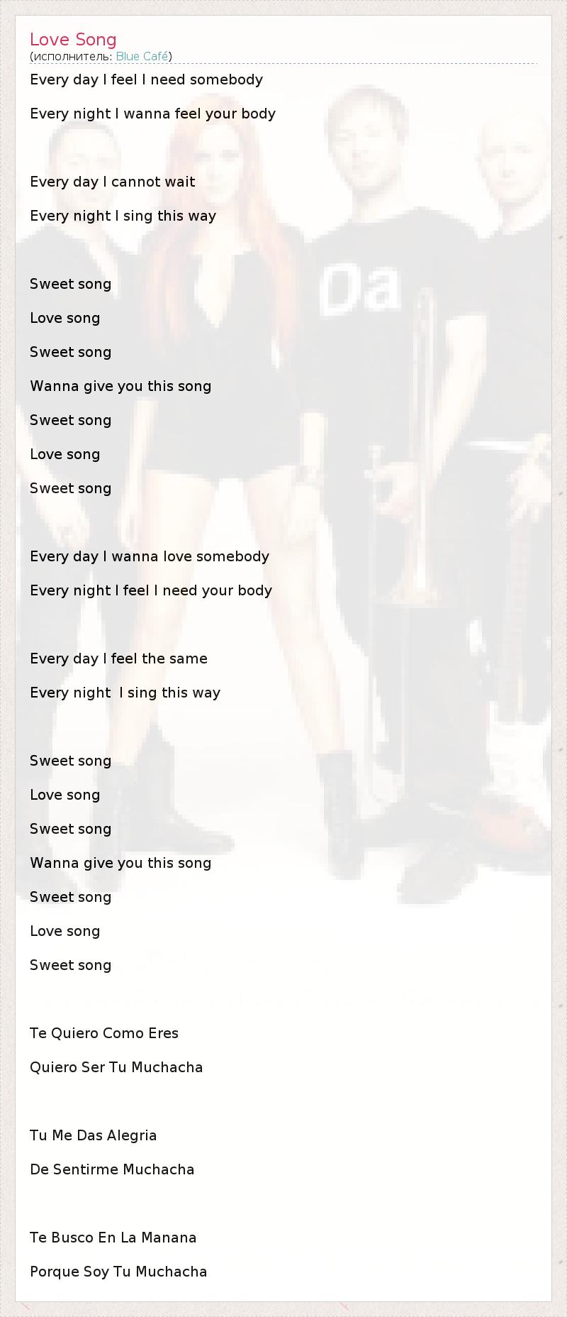 Every day I feel I need somebody Every night I wanna feel your body Every day I cannot wait Every night I sing this way Sweet song Love song Sweet song Wanna give you this song Sweet song Love song Sweet song Every day I wanna love somebody Every night I feel I need your body Every day I feel the same Every night I sing this way Sweet song Love song Sweet song Wanna give you this song Sweet song Love song Sweet song Te Quiero Como Eres Quiero Ser Tu Muchacha Tu Me Das Alegria De Sentirme Muchacha Te Busco En La Manana Porque Soy Tu Muchacha