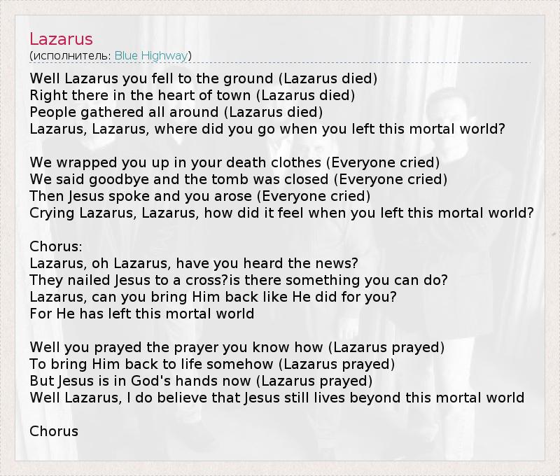 Crying Lazarus, Lazarus, how did it feel when you left this mortal world?