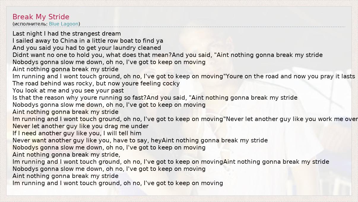 Last night I had the strangest dream I sailed away to China in a little row boat to find ya And you said you had to get your laundry cleaned Didnt want no one to hold you, what does that mean?And you said, "Aint nothing gonna break my stride Nobodys gonna slow me down, oh no, I've got to keep on moving Aint nothing gonna break my stride Im running and I wont touch ground, oh no, I've got to keep on moving"Youre on the road and now you pray it lasts The road behind was rocky, but now youre feeling cocky You look at me and you see your past Is that the reason why youre running so fast?And you said, "Aint nothing gonna break my stride Nobodys gonna slow me down, oh no, I've got to keep on moving Aint nothing gonna break my stride Im running and I wont touch ground, oh no, I've got to keep on moving"Never let another guy like you work me over Never let another guy like you drag me under If I need another guy like you, I will tell him Never want another guy like you, have to say, heyAint nothing gonna break my stride Nobodys gonna slow me down, oh no, I've got to keep on moving Aint nothing gonna break my stride, Im running and I wont touch ground, oh no, I've got to keep on movingAint nothing gonna break my stride Nobodys gonna slow me down, oh no, I've got to keep on moving Aint nothing gonna break my stride Im running and I wont touch ground, oh no, I've got to keep on moving