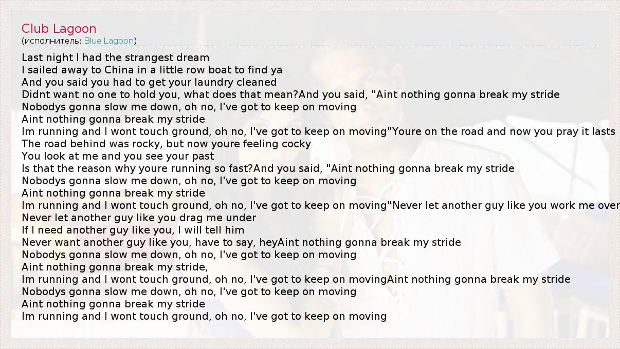 Last night I had the strangest dream I sailed away to China in a little row boat to find ya And you said you had to get your laundry cleaned Didnt want no one to hold you, what does that mean?And you said, "Aint nothing gonna break my stride Nobodys gonna slow me down, oh no, I've got to keep on moving Aint nothing gonna break my stride Im running and I wont touch ground, oh no, I've got to keep on moving"Youre on the road and now you pray it lasts The road behind was rocky, but now youre feeling cocky You look at me and you see your past Is that the reason why youre running so fast?And you said, "Aint nothing gonna break my stride Nobodys gonna slow me down, oh no, I've got to keep on moving Aint nothing gonna break my stride Im running and I wont touch ground, oh no, I've got to keep on moving"Never let another guy like you work me over Never let another guy like you drag me under If I need another guy like you, I will tell him Never want another guy like you, have to say, heyAint nothing gonna break my stride Nobodys gonna slow me down, oh no, I've got to keep on moving Aint nothing gonna break my stride, Im running and I wont touch ground, oh no, I've got to keep on movingAint nothing gonna break my stride Nobodys gonna slow me down, oh no, I've got to keep on moving Aint nothing gonna break my stride Im running and I wont touch ground, oh no, I've got to keep on moving