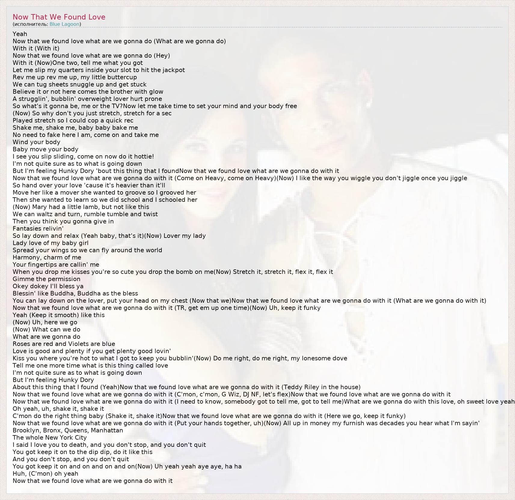 Yeah Now that we found love what are we gonna do (What are we gonna do) With it (With it) Now that we found love what are we gonna do (Hey) With it (Now)One two, tell me what you got Let me slip my quarters inside your slot to hit the jackpot Rev me up rev me up, my little buttercup We can tug sheets snuggle up and get stuck Believe it or not here comes the brother with glow A strugglin', bubblin' overweight lover hurt prone So what's it gonna be, me or the TV?Now let me take time to set your mind and your body free (Now) So why don't you just stretch, stretch for a sec Played stretch so I could cop a quick rec Shake me, shake me, baby baby bake me No need to fake here I am, come on and take me Wind your body Baby move your body I see you slip sliding, come on now do it hottie! I'm not quite sure as to what is going down But I'm feeling Hunky Dory 'bout this thing that I foundNow that we found love what are we gonna do with it Now that we found love what are we gonna do with it (Come on Heavy, come on Heavy)(Now) I like the way you wiggle you don't jiggle once you jiggle So hand over your love 'cause it's heavier than it'll Move her like a mover she wanted to groove so I grooved her Then she wanted to learn so we did school and I schooled her (Now) Mary had a little lamb, but not like this We can waltz and turn, rumble tumble and twist Then you think you gonna give in Fantasies relivin' So lay down and relax (Yeah baby, that's it)(Now) Lover my lady Lady love of my baby girl Spread your wings so we can fly around the world Harmony, charm of me Your fingertips are callin' me When you drop me kisses you're so cute you drop the bomb on me(Now) Stretch it, stretch it, flex it, flex it Gimme the permission Okey dokey I'll bless ya Blessin' like Buddha, Buddha as the bless You can lay down on the lover, put your head on my chest (Now that we)Now that we found love what are we gonna do with it (What are we gonna do with it) Now that we found love what are we gonna do with it (TR, get em up one time)(Now) Uh, keep it funky Yeah (Keep it smooth) like this (Now) Uh, here we go (Now) What can we do What are we gonna do Roses are red and Violets are blue Love is good and plenty if you get plenty good lovin' Kiss you where you're hot to what I got to keep you bubblin'(Now) Do me right, do me right, my lonesome dove Tell me one more time what is this thing called love I'm not quite sure as to what is going down But I'm feeling Hunky Dory About this thing that I found (Yeah)Now that we found love what are we gonna do with it (Teddy Riley in the house) Now that we found love what are we gonna do with it (C'mon, c'mon, G Wiz, DJ NF, let's flex)Now that we found love what are we gonna do with it Now that we found love what are we gonna do with it (I need to know, somebody got to tell me, got to tell me)What are we gonna do with this love, oh sweet love yeah Oh yeah, uh, shake it, shake it C'mon do the right thing baby (Shake it, shake it)Now that we found love what are we gonna do with it (Here we go, keep it funky) Now that we found love what are we gonna do with it (Put your hands together, uh)(Now) All up in money my furnish was decades you hear what I'm sayin' Brooklyn, Bronx, Queens, Manhattan The whole New York City I said I love you to death, and you don't stop, and you don't quit You got keep it on to the dip dip, do it like this And you don't stop, and you don't quit You got keep it on and on and on and on(Now) Uh yeah yeah aye aye, ha ha Huh, (C'mon) oh yeah Now that we found love what are we gonna do with it
