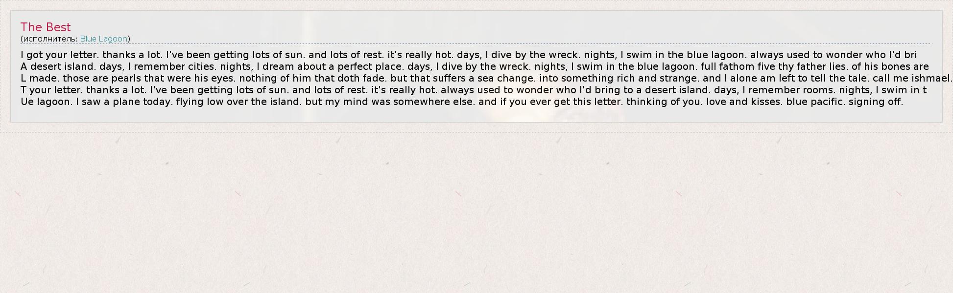 I got your letter. thanks a lot. I've been getting lots of sun. and lots of rest. it's really hot. days, I dive by the wreck. nights, I swim in the blue lagoon. always used to wonder who I'd bri A desert island. days, I remember cities. nights, I dream about a perfect place. days, I dive by the wreck. nights, I swim in the blue lagoon. full fathom five thy father lies. of his bones are L made. those are pearls that were his eyes. nothing of him that doth fade. but that suffers a sea change. into something rich and strange. and I alone am left to tell the tale. call me ishmael. T your letter. thanks a lot. I've been getting lots of sun. and lots of rest. it's really hot. always used to wonder who I'd bring to a desert island. days, I remember rooms. nights, I swim in t Ue lagoon. I saw a plane today. flying low over the island. but my mind was somewhere else. and if you ever get this letter. thinking of you. love and kisses. blue pacific. signing off.