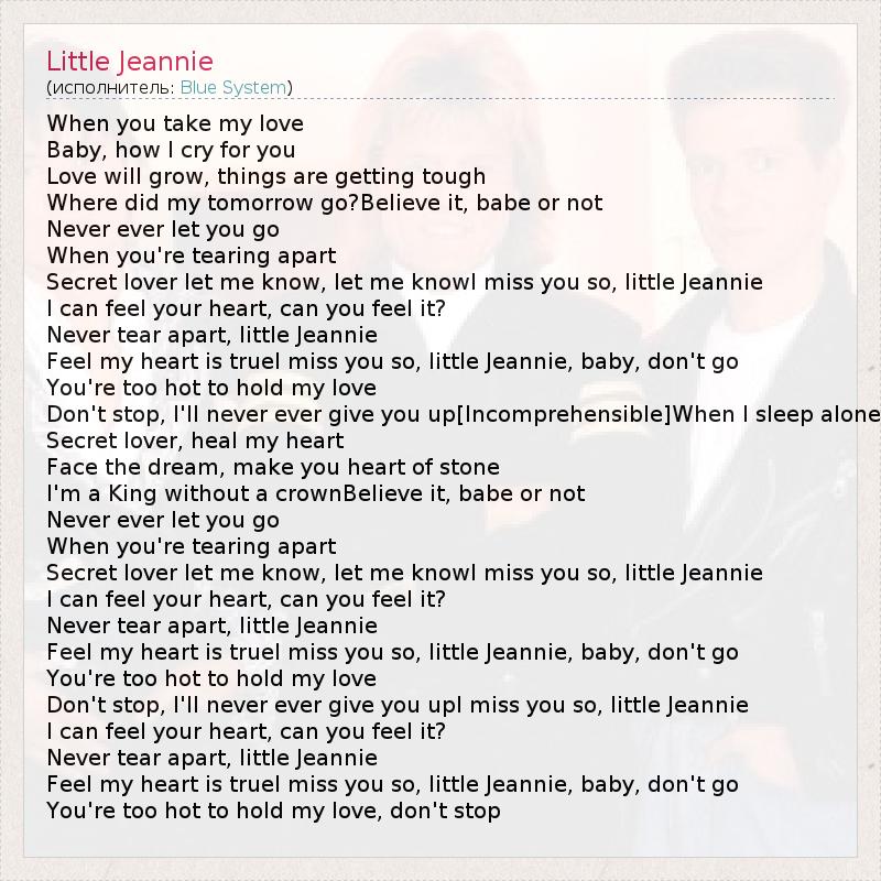When you take my love Baby, how I cry for you Love will grow, things are getting tough Where did my tomorrow go?Believe it, babe or not Never ever let you go When you're tearing apart Secret lover let me know, let me knowI miss you so, little Jeannie I can feel your heart, can you feel it? Never tear apart, little Jeannie Feel my heart is trueI miss you so, little Jeannie, baby, don't go You're too hot to hold my love Don't stop, I'll never ever give you up[Incomprehensible]When I sleep alone Secret lover, heal my heart Face the dream, make you heart of stone I'm a King without a crownBelieve it, babe or not Never ever let you go When you're tearing apart Secret lover let me know, let me knowI miss you so, little Jeannie I can feel your heart, can you feel it? Never tear apart, little Jeannie Feel my heart is trueI miss you so, little Jeannie, baby, don't go You're too hot to hold my love Don't stop, I'll never ever give you upI miss you so, little Jeannie I can feel your heart, can you feel it? Never tear apart, little Jeannie Feel my heart is trueI miss you so, little Jeannie, baby, don't go You're too hot to hold my love, don't stop