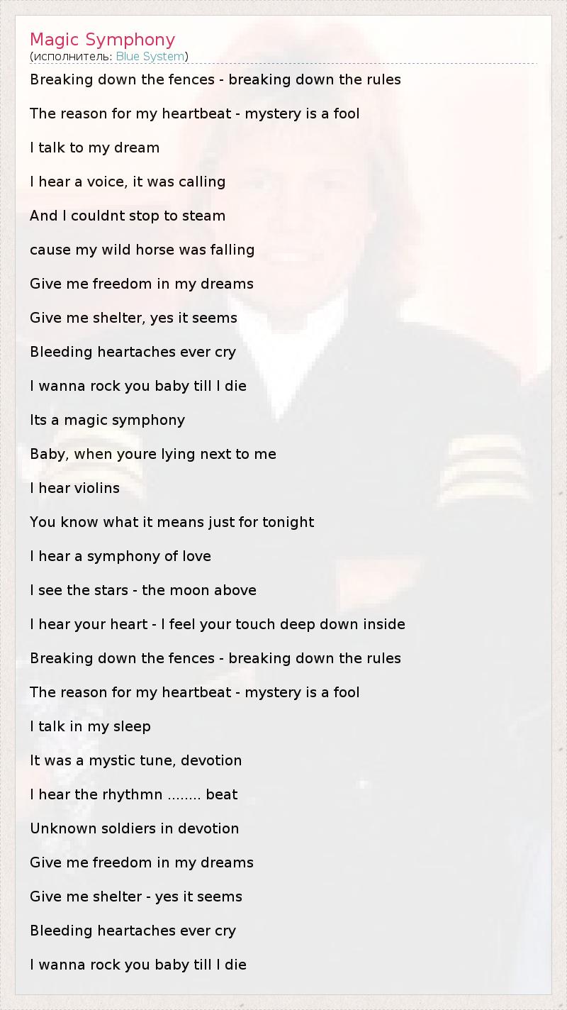Breaking down the fences - breaking down the rules The reason for my heartbeat - mystery is a fool I talk to my dream I hear a voice, it was calling And I couldnt stop to steam cause my wild horse was falling Give me freedom in my dreams Give me shelter, yes it seems Bleeding heartaches ever cry I wanna rock you baby till I die Its a magic symphony Baby, when youre lying next to me I hear violins You know what it means just for tonight I hear a symphony of love I see the stars - the moon above I hear your heart - I feel your touch deep down inside Breaking down the fences - breaking down the rules The reason for my heartbeat - mystery is a fool I talk in my sleep It was a mystic tune, devotion I hear the rhythmn ........ beat Unknown soldiers in devotion Give me freedom in my dreams Give me shelter - yes it seems Bleeding heartaches ever cry I wanna rock you baby till I die