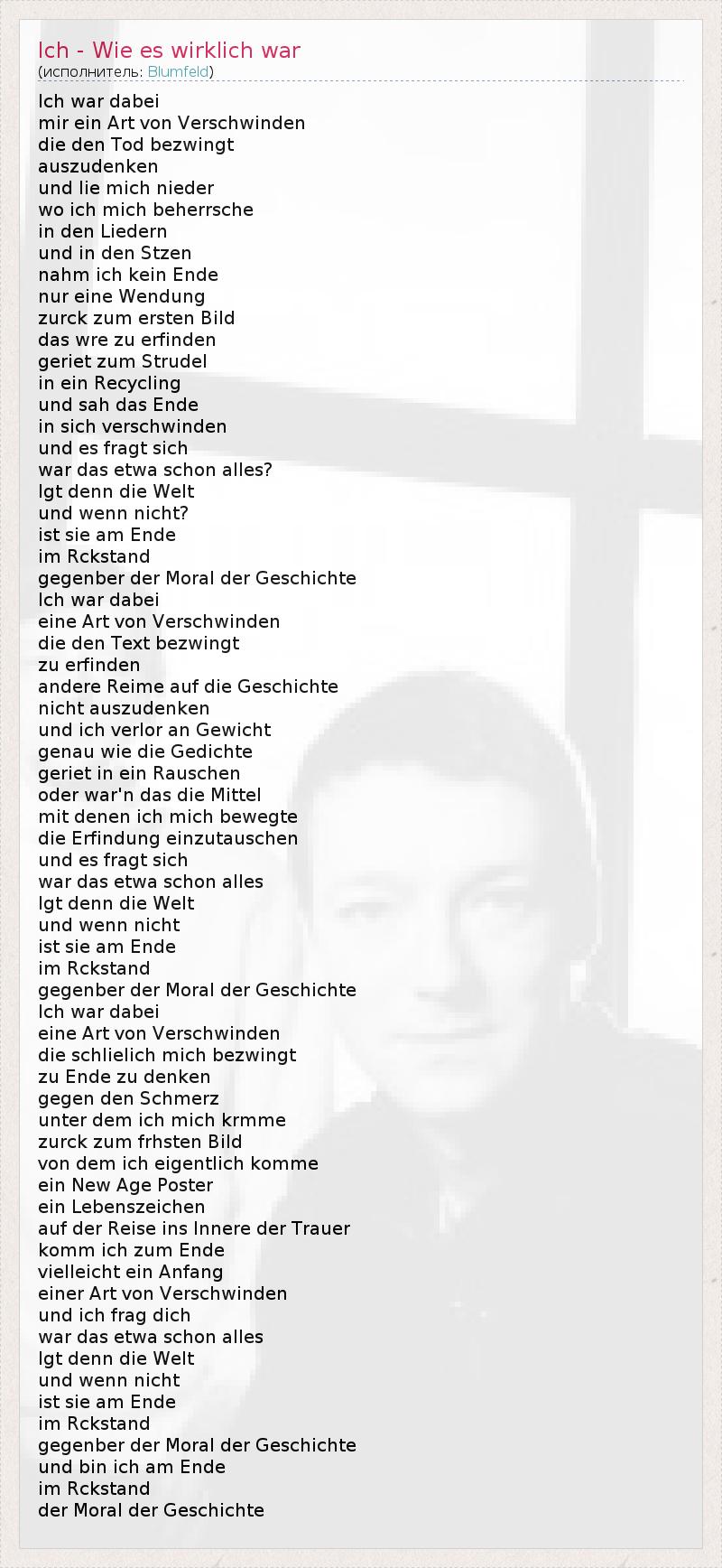 Ich war dabei mir ein Art von Verschwinden die den Tod bezwingt auszudenken und lie mich nieder wo ich mich beherrsche in den Liedern und in den Stzen nahm ich kein Ende nur eine Wendung zurck zum ersten Bild das wre zu erfinden geriet zum Strudel in ein Recycling und sah das Ende in sich verschwinden und es fragt sich war das etwa schon alles? lgt denn die Welt und wenn nicht? ist sie am Ende im Rckstand gegenber der Moral der Geschichte Ich war dabei eine Art von Verschwinden die den Text bezwingt zu erfinden andere Reime auf die Geschichte nicht auszudenken und ich verlor an Gewicht genau wie die Gedichte geriet in ein Rauschen oder war'n das die Mittel mit denen ich mich bewegte die Erfindung einzutauschen und es fragt sich war das etwa schon alles lgt denn die Welt und wenn nicht ist sie am Ende im Rckstand gegenber der Moral der Geschichte Ich war dabei eine Art von Verschwinden die schlielich mich bezwingt zu Ende zu denken gegen den Schmerz unter dem ich mich krmme zurck zum frhsten Bild von dem ich eigentlich komme ein New Age Poster ein Lebenszeichen auf der Reise ins Innere der Trauer komm ich zum Ende vielleicht ein Anfang einer Art von Verschwinden und ich frag dich war das etwa schon alles lgt denn die Welt und wenn nicht ist sie am Ende im Rckstand gegenber der Moral der Geschichte und bin ich am Ende im Rckstand der Moral der Geschichte
