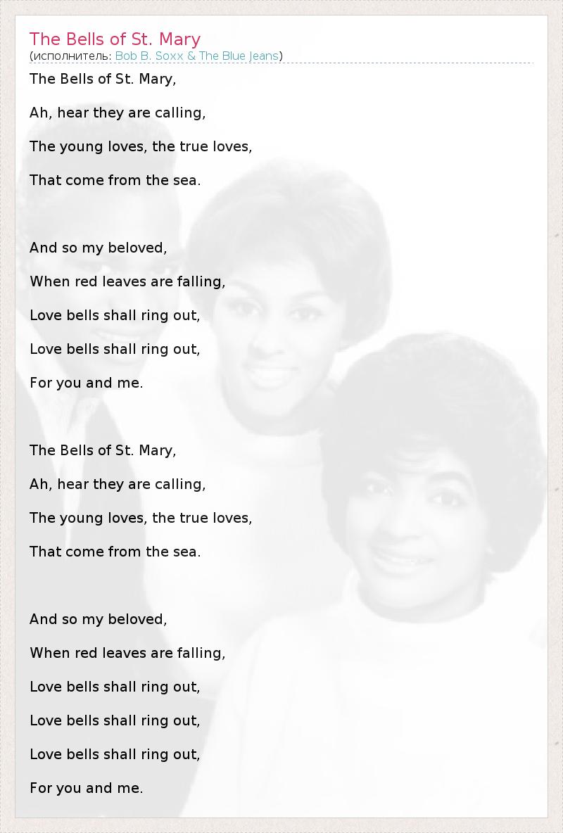 The Bells of St. Mary, Ah, hear they are calling, The young loves, the true loves, That come from the sea. And so my beloved, When red leaves are falling, Love bells shall ring out, Love bells shall ring out, For you and me. The Bells of St. Mary, Ah, hear they are calling, The young loves, the true loves, That come from the sea. And so my beloved, When red leaves are falling, Love bells shall ring out, Love bells shall ring out, Love bells shall ring out, For you and me.