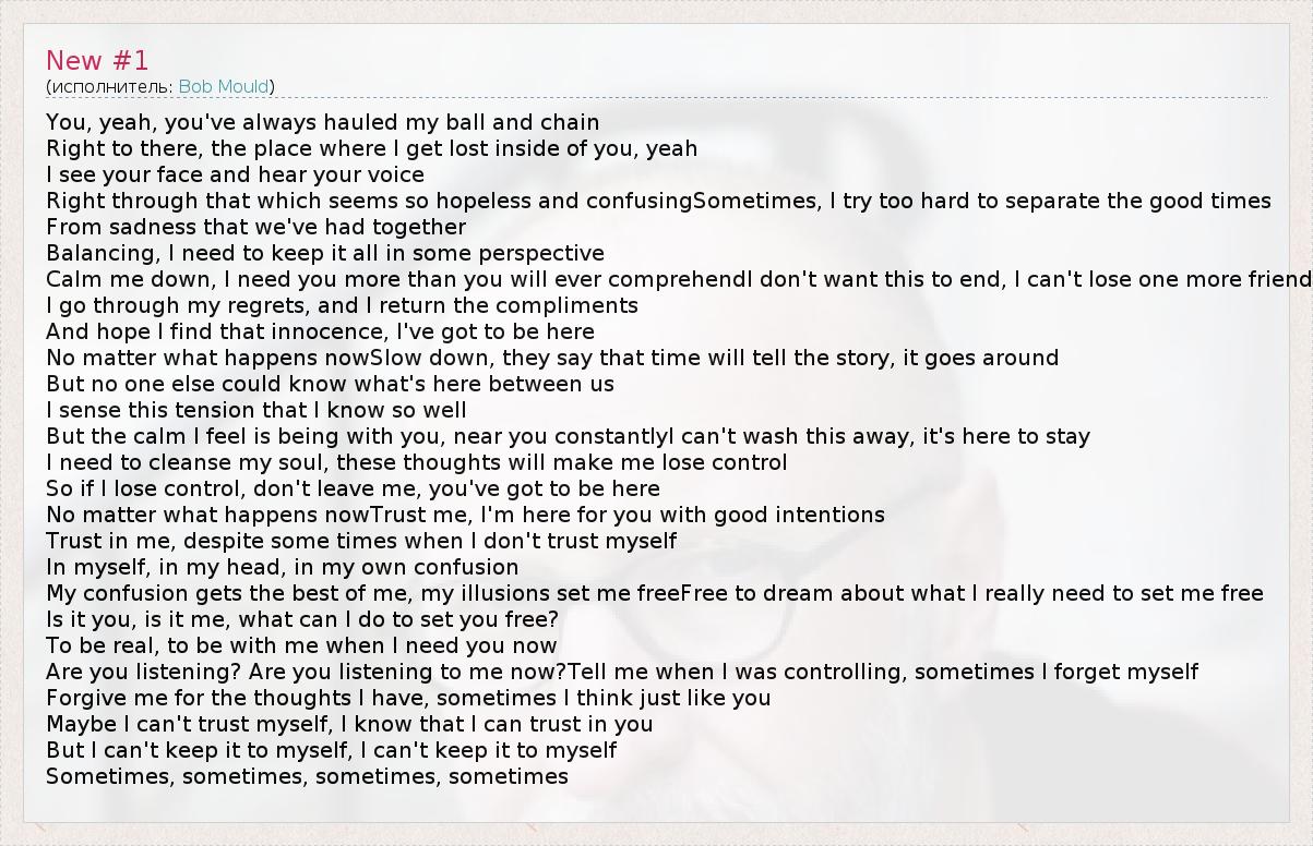 You, yeah, you've always hauled my ball and chain Right to there, the place where I get lost inside of you, yeah I see your face and hear your voice Right through that which seems so hopeless and confusingSometimes, I try too hard to separate the good times From sadness that we've had together Balancing, I need to keep it all in some perspective Calm me down, I need you more than you will ever comprehendI don't want this to end, I can't lose one more friend I go through my regrets, and I return the compliments And hope I find that innocence, I've got to be here No matter what happens nowSlow down, they say that time will tell the story, it goes around But no one else could know what's here between us I sense this tension that I know so well But the calm I feel is being with you, near you constantlyI can't wash this away, it's here to stay I need to cleanse my soul, these thoughts will make me lose control So if I lose control, don't leave me, you've got to be here No matter what happens nowTrust me, I'm here for you with good intentions Trust in me, despite some times when I don't trust myself In myself, in my head, in my own confusion My confusion gets the best of me, my illusions set me freeFree to dream about what I really need to set me free Is it you, is it me, what can I do to set you free? To be real, to be with me when I need you now Are you listening? Are you listening to me now?Tell me when I was controlling, sometimes I forget myself Forgive me for the thoughts I have, sometimes I think just like you Maybe I can't trust myself, I know that I can trust in you But I can't keep it to myself, I can't keep it to myself Sometimes, sometimes, sometimes, sometimes