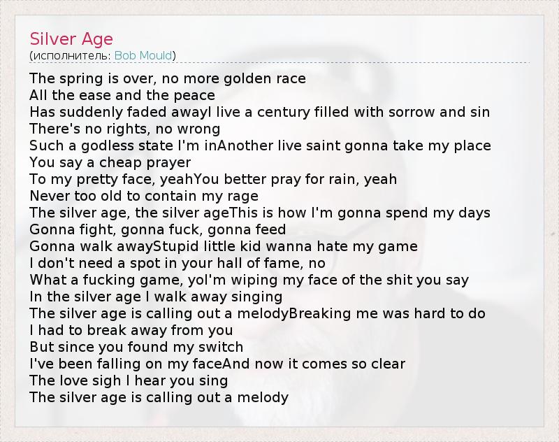 The spring is over, no more golden race All the ease and the peace Has suddenly faded awayI live a century filled with sorrow and sin There's no rights, no wrong Such a godless state I'm inAnother live saint gonna take my place You say a cheap prayer To my pretty face, yeahYou better pray for rain, yeah Never too old to contain my rage The silver age, the silver ageThis is how I'm gonna spend my days Gonna fight, gonna fuck, gonna feed Gonna walk awayStupid little kid wanna hate my game I don't need a spot in your hall of fame, no What a fucking game, yoI'm wiping my face of the shit you say In the silver age I walk away singing The silver age is calling out a melodyBreaking me was hard to do I had to break away from you But since you found my switch I've been falling on my faceAnd now it comes so clear The love sigh I hear you sing The silver age is calling out a melody