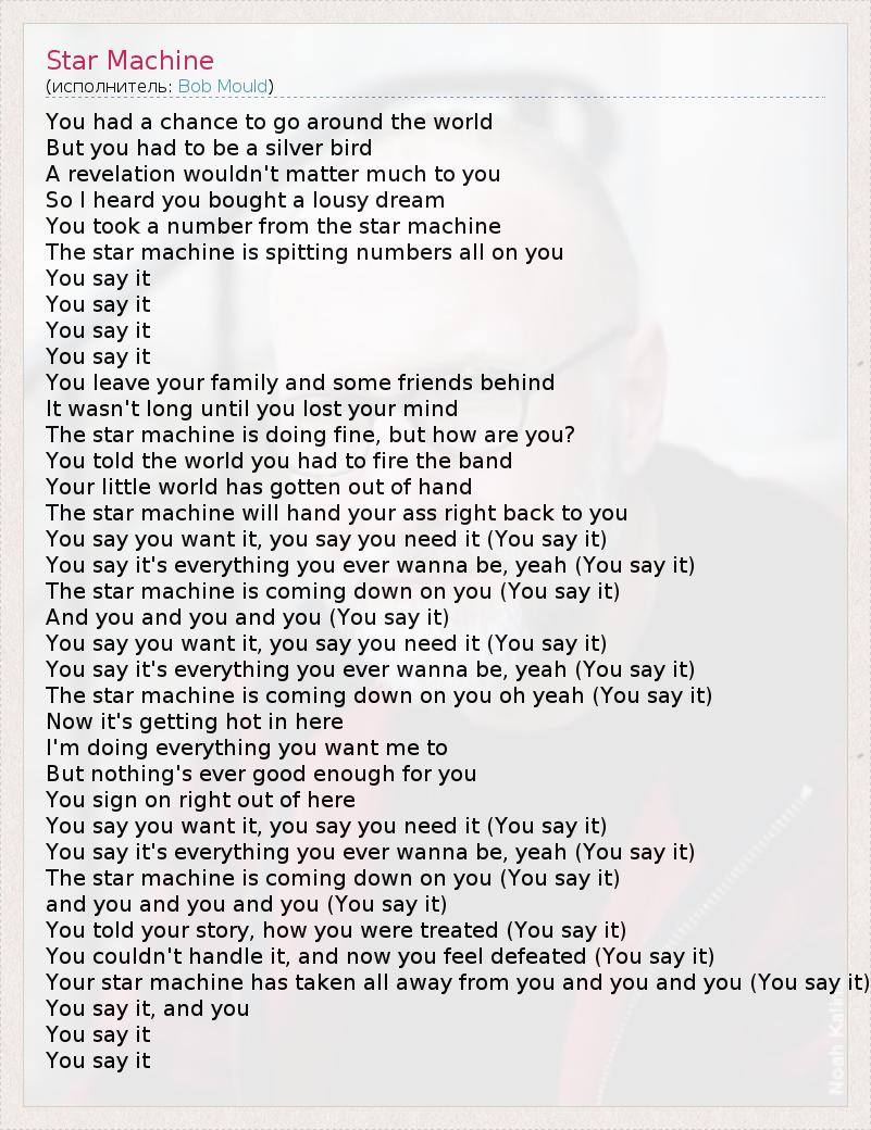 You had a chance to go around the world But you had to be a silver bird A revelation wouldn't matter much to you So I heard you bought a lousy dream You took a number from the star machine The star machine is spitting numbers all on you You say it You say it You say it You say it You leave your family and some friends behind It wasn't long until you lost your mind The star machine is doing fine, but how are you? You told the world you had to fire the band Your little world has gotten out of hand The star machine will hand your ass right back to you You say you want it, you say you need it (You say it) You say it's everything you ever wanna be, yeah (You say it) The star machine is coming down on you (You say it) And you and you and you (You say it) You say you want it, you say you need it (You say it) You say it's everything you ever wanna be, yeah (You say it) The star machine is coming down on you oh yeah (You say it) Now it's getting hot in here I'm doing everything you want me to But nothing's ever good enough for you You sign on right out of here You say you want it, you say you need it (You say it) You say it's everything you ever wanna be, yeah (You say it) The star machine is coming down on you (You say it) and you and you and you (You say it) You told your story, how you were treated (You say it) You couldn't handle it, and now you feel defeated (You say it) Your star machine has taken all away from you and you and you (You say it) You say it, and you You say it You say it
