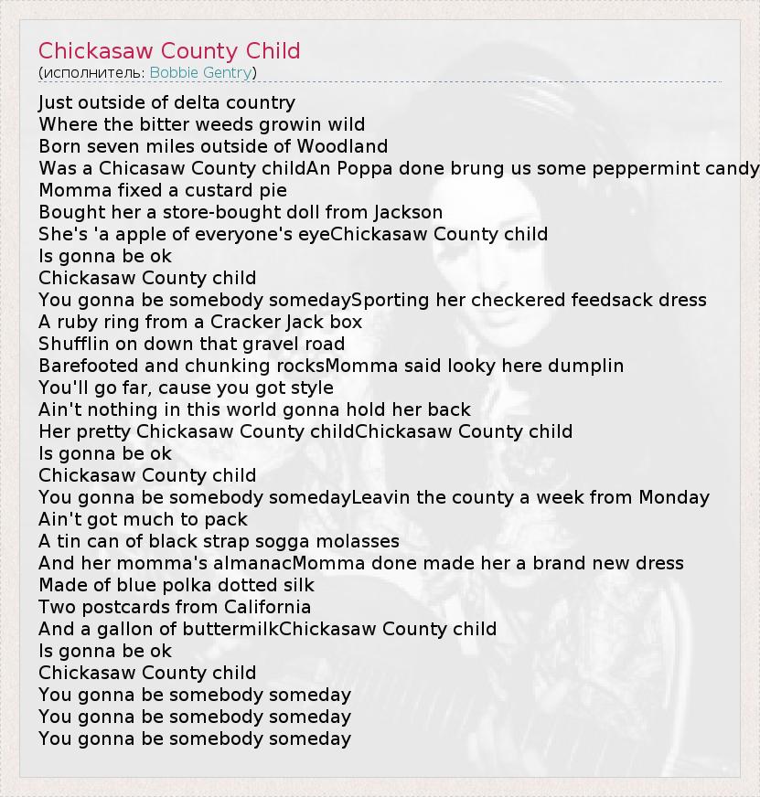 Just outside of delta country Where the bitter weeds growin wild Born seven miles outside of Woodland Was a Chicasaw County childAn Poppa done brung us some peppermint candy Momma fixed a custard pie Bought her a store-bought doll from Jackson She's 'a apple of everyone's eyeChickasaw County child Is gonna be ok Chickasaw County child You gonna be somebody somedaySporting her checkered feedsack dress A ruby ring from a Cracker Jack box Shufflin on down that gravel road Barefooted and chunking rocksMomma said looky here dumplin You'll go far, cause you got style Ain't nothing in this world gonna hold her back Her pretty Chickasaw County childChickasaw County child Is gonna be ok Chickasaw County child You gonna be somebody somedayLeavin the county a week from Monday Ain't got much to pack A tin can of black strap sogga molasses And her momma's almanacMomma done made her a brand new dress Made of blue polka dotted silk Two postcards from California And a gallon of buttermilkChickasaw County child Is gonna be ok Chickasaw County child You gonna be somebody someday You gonna be somebody someday You gonna be somebody someday