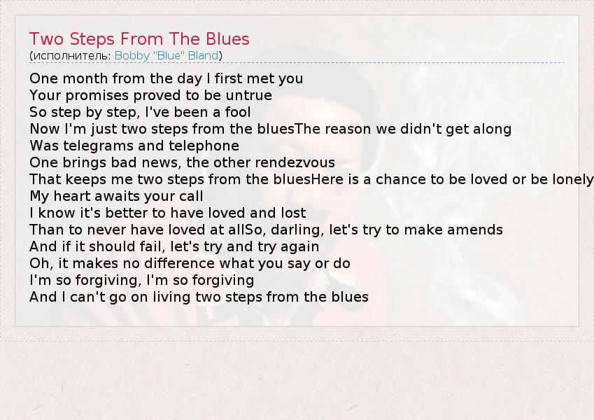 One month from the day I first met you Your promises proved to be untrue So step by step, I've been a fool Now I'm just two steps from the bluesThe reason we didn't get along Was telegrams and telephone One brings bad news, the other rendezvous That keeps me two steps from the bluesHere is a chance to be loved or be lonely My heart awaits your call I know it's better to have loved and lost Than to never have loved at allSo, darling, let's try to make amends And if it should fail, let's try and try again Oh, it makes no difference what you say or do I'm so forgiving, I'm so forgiving And I can't go on living two steps from the blues