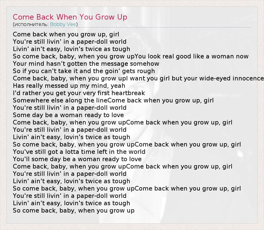 Come back when you grow up, girl You're still livin' in a paper-doll world Livin' ain't easy, lovin's twice as tough So come back, baby, when you grow upYou look real good like a woman now Your mind hasn't gotten the message somehow So if you can't take it and the goin' gets rough Come back, baby, when you grow upI want you girl but your wide-eyed innocence Has really messed up my mind, yeah I'd rather you get your very first heartbreak Somewhere else along the lineCome back when you grow up, girl You're still livin' in a paper-doll world Some day be a woman ready to love Come back, baby, when you grow upCome back when you grow up, girl You're still livin' in a paper-doll world Livin' ain't easy, lovin's twice as tough So come back, baby, when you grow upCome back when you grow up, girl You've still got a lotta time left in the world You'll some day be a woman ready to love Come back, baby, when you grow upCome back when you grow up, girl You're still livin' in a paper-doll world Livin' ain't easy, lovin's twice as tough So come back, baby, when you grow upCome back when you grow up, girl You're still livin' in a paper-doll world Livin' ain't easy, lovin's twice as tough So come back, baby, when you grow up