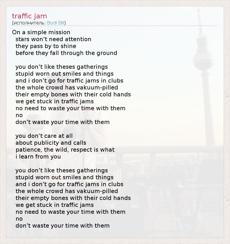 On a simple mission stars won't need attention they pass by to shine before they fall through the ground you don't like theses gatherings stupid worn out smiles and things and i don't go for traffic jams in clubs the whole crowd has vakuum-pilled their empty bones with their cold hands we get stuck in traffic jams no need to waste your time with them no don't waste your time with them you don't care at all about publicity and calls patience, the wild, respect is what i learn from you you don't like theses gatherings stupid worn out smiles and things and i don't go for traffic jams in clubs the whole crowd has vakuum-pilled their empty bones with their cold hands we get stuck in traffic jams no need to waste your time with them no don't waste your time with them