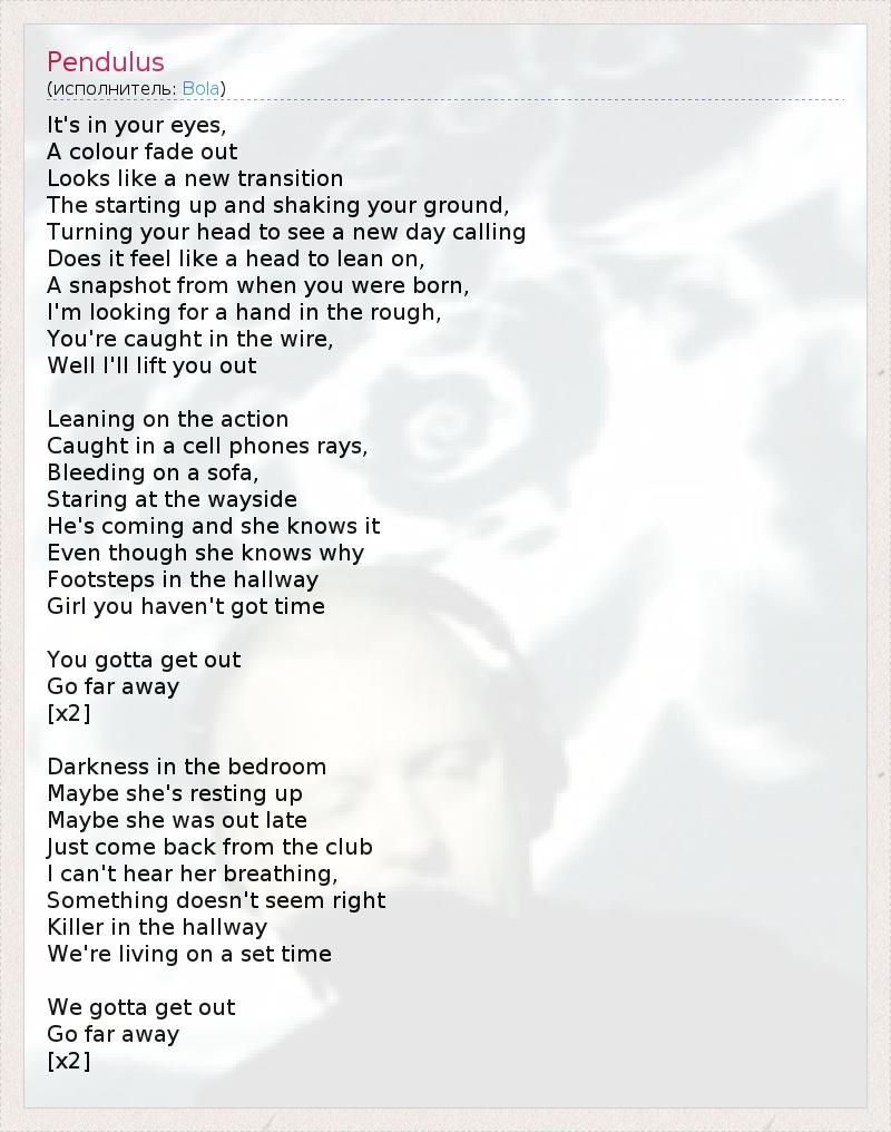 Это в твоих в глазах, Блеск их тускнеет, Это словно новый переход, Это начинается и сотрясает землю под твоими ногами, Обращая твой взор к зову нового дня, Похоже ли, что этому можно ввериться, Когда вся жизнь проносится перед глазами, Я на ощупь ищу твою руку, Ты попалась на крючок, Что ж, я вытащу тебя Ты увлеклась, Пойманная в сеть телефонного излучения, Ты истекаешь кровью на диване, Уставившись на дорогу возле дома, Он идет, и она знает это, Хоть и знает, почему, В коридоре раздаются шаги, Детка, у тебя нет времени Ты должна выбираться, Уйти подальше отсюда [x2] Тьма в спальне, Может быть, она отдыхает, Может быть, ее не было допоздна И она только что возвратилась из клуба? Я не слышу её дыхания, Кажется, что-то не так, Убийца в коридоре, Мы живем по отведенному нам времени Мы должны выбираться, Уйти подальше отсюда [x2]