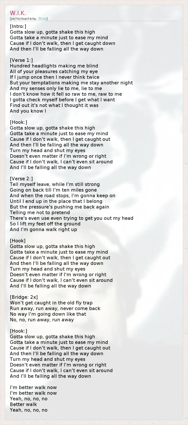 [Intro:] Gotta slow up, gotta shake this high Gotta take a minute just to ease my mind Cause if I don't walk, then I get caught down And then I'll be falling all the way down [Verse 1:] Hundred headlights making me blind All of your pleasures catching my eye If I jump once then I never think twice But your temptations making me stay another night And my senses only lie to me, lie to me I don't know how it fell so raw to me, raw to me I gotta check myself before I get what I want Find out it's not what I thought it was And you know I [Hook:] Gotta slow up, gotta shake this high Gotta take a minute just to ease my mind Cause if I don't walk, then I get caught out And then I'll be falling all the way down Turn my head and shut my eyes Doesn't even matter if I'm wrong or right Cause if I don't walk, I can't even sit around And I'll be falling all the way down [Verse 2:] Tell myself leave, while I'm still strong Going on back till I'm ten miles gone And when the road stops, I'm gonna keep on Until I end up in the place that I belong But the pressure's pushing me back again Telling me not to pretend There's even use even trying to get you out my head So I lift my feet off the ground And I'm gonna walk right up [Hook] Gotta slow up, gotta shake this high Gotta take a minute just to ease my mind Cause if I don't walk, then I get caught out And then I'll be falling all the way down Turn my head and shut my eyes Doesn't even matter if I'm wrong or right Cause if I don't walk, I can't even sit around And I'll be falling all the way down [Bridge: 2x] Won't get caught in the old fly trap Run away, run away, never come back No way I'm going down like that No, no, run away, run away [Hook:] Gotta slow up, gotta shake this high Gotta take a minute just to ease my mind Cause if I don't walk, then I get caught out And then I'll be falling all the way down Turn my head and shut my eyes Doesn't even matter if I'm wrong or right Cause if I don't walk, I can't even sit around And I'll be falling all the way down I'm better walk now I'm better walk now Yeah, no, no, no Better walk Yeah, no, no, no