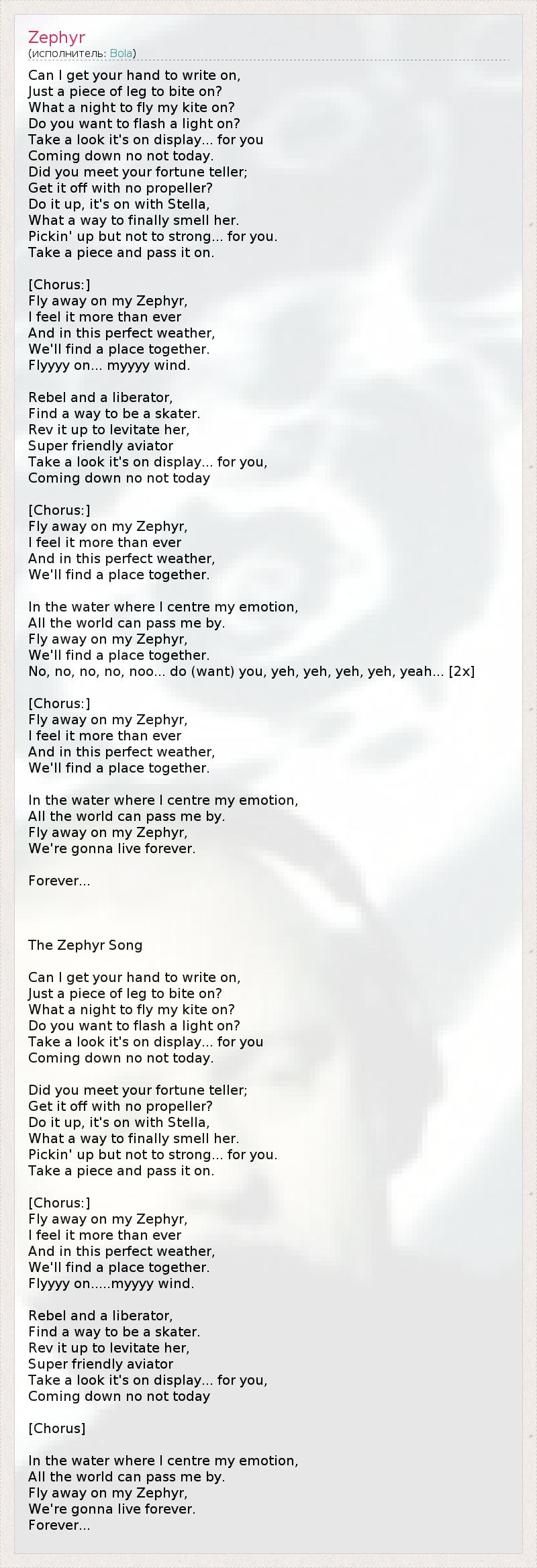 Can I get your hand to write on, Just a piece of leg to bite on? What a night to fly my kite on? Do you want to flash a light on? Take a look it's on display... for you Coming down no not today. Did you meet your fortune teller; Get it off with no propeller? Do it up, it's on with Stella, What a way to finally smell her. Pickin' up but not to strong... for you. Take a piece and pass it on. [Chorus:] Fly away on my Zephyr, I feel it more than ever And in this perfect weather, We'll find a place together. Flyyyy on... myyyy wind. Rebel and a liberator, Find a way to be a skater. Rev it up to levitate her, Super friendly aviator Take a look it's on display... for you, Coming down no not today [Chorus:] Fly away on my Zephyr, I feel it more than ever And in this perfect weather, We'll find a place together. In the water where I centre my emotion, All the world can pass me by. Fly away on my Zephyr, We'll find a place together. No, no, no, no, noo... do (want) you, yeh, yeh, yeh, yeh, yeah... [2x] [Chorus:] Fly away on my Zephyr, I feel it more than ever And in this perfect weather, We'll find a place together. In the water where I centre my emotion, All the world can pass me by. Fly away on my Zephyr, We're gonna live forever. Forever... The Zephyr Song Can I get your hand to write on, Just a piece of leg to bite on? What a night to fly my kite on? Do you want to flash a light on? Take a look it's on display... for you Coming down no not today. Did you meet your fortune teller; Get it off with no propeller? Do it up, it's on with Stella, What a way to finally smell her. Pickin' up but not to strong... for you. Take a piece and pass it on. [Chorus:] Fly away on my Zephyr, I feel it more than ever And in this perfect weather, We'll find a place together. Flyyyy on.....myyyy wind. Rebel and a liberator, Find a way to be a skater. Rev it up to levitate her, Super friendly aviator Take a look it's on display... for you, Coming down no not today [Chorus] In the water where I centre my emotion, All the world can pass me by. Fly away on my Zephyr, We're gonna live forever. Forever...