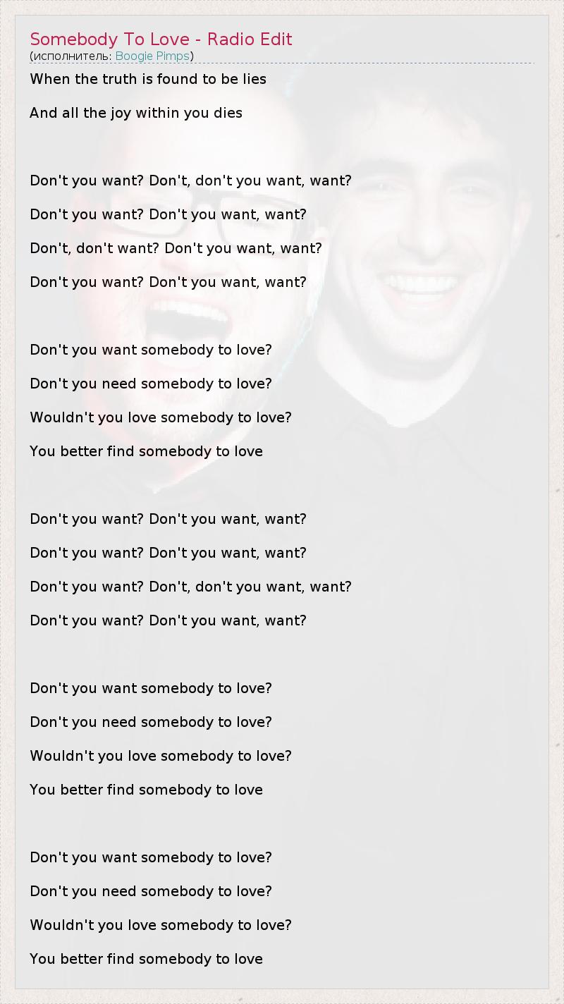 When the truth is found to be lies And all the joy within you dies Don't you want? Don't, don't you want, want? Don't you want? Don't you want, want? Don't, don't want? Don't you want, want? Don't you want? Don't you want, want? Don't you want somebody to love? Don't you need somebody to love? Wouldn't you love somebody to love? You better find somebody to love Don't you want? Don't you want, want? Don't you want? Don't you want, want? Don't you want? Don't, don't you want, want? Don't you want? Don't you want, want? Don't you want somebody to love? Don't you need somebody to love? Wouldn't you love somebody to love? You better find somebody to love Don't you want somebody to love? Don't you need somebody to love? Wouldn't you love somebody to love? You better find somebody to love