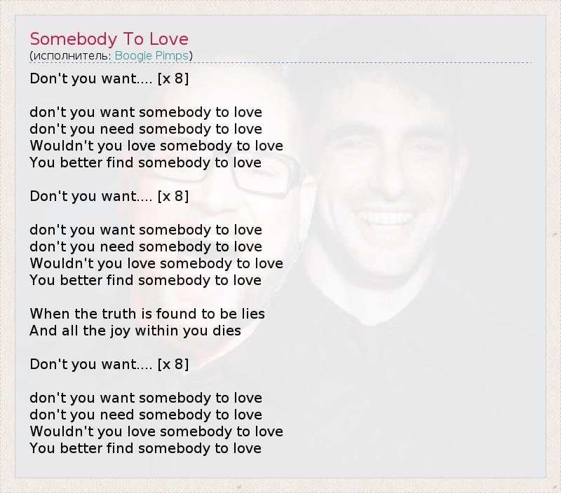 Don't you want.... [x 8] don't you want somebody to love don't you need somebody to love Wouldn't you love somebody to love You better find somebody to love Don't you want.... [x 8] don't you want somebody to love don't you need somebody to love Wouldn't you love somebody to love You better find somebody to love When the truth is found to be lies And all the joy within you dies Don't you want.... [x 8] don't you want somebody to love don't you need somebody to love Wouldn't you love somebody to love You better find somebody to love
