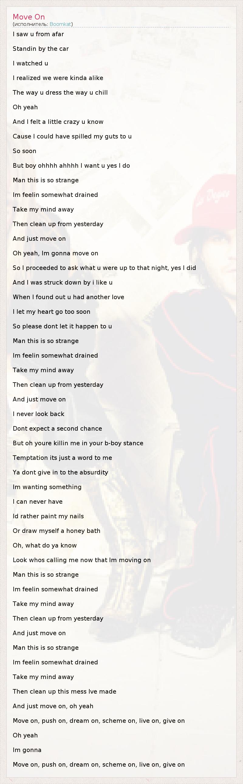 I saw u from afar Standin by the car I watched u I realized we were kinda alike The way u dress the way u chill Oh yeah And I felt a little crazy u know Cause I could have spilled my guts to u So soon But boy ohhhh ahhhh I want u yes I do Man this is so strange Im feelin somewhat drained Take my mind away Then clean up from yesterday And just move on Oh yeah, Im gonna move on So I proceeded to ask what u were up to that night, yes I did And I was struck down by i like u When I found out u had another love I let my heart go too soon So please dont let it happen to u Man this is so strange Im feelin somewhat drained Take my mind away Then clean up from yesterday And just move on I never look back Dont expect a second chance But oh youre killin me in your b-boy stance Temptation its just a word to me Ya dont give in to the absurdity Im wanting something I can never have Id rather paint my nails Or draw myself a honey bath Oh, what do ya know Look whos calling me now that Im moving on Man this is so strange Im feelin somewhat drained Take my mind away Then clean up from yesterday And just move on Man this is so strange Im feelin somewhat drained Take my mind away Then clean up this mess Ive made And just move on, oh yeah Move on, push on, dream on, scheme on, live on, give on Oh yeah Im gonna Move on, push on, dream on, scheme on, live on, give on