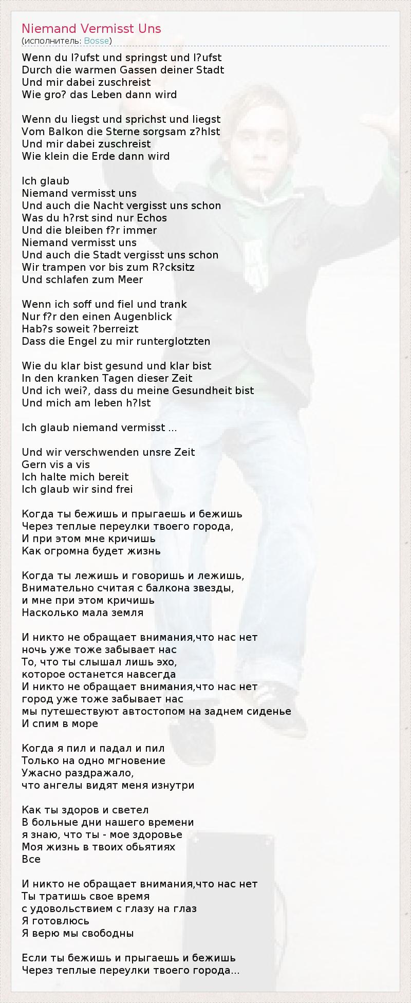 Wenn du l?ufst und springst und l?ufst Durch die warmen Gassen deiner Stadt Und mir dabei zuschreist Wie gro? das Leben dann wird Wenn du liegst und sprichst und liegst Vom Balkon die Sterne sorgsam z?hlst Und mir dabei zuschreist Wie klein die Erde dann wird Ich glaub Niemand vermisst uns Und auch die Nacht vergisst uns schon Was du h?rst sind nur Echos Und die bleiben f?r immer Niemand vermisst uns Und auch die Stadt vergisst uns schon Wir trampen vor bis zum R?cksitz Und schlafen zum Meer Wenn ich soff und fiel und trank Nur f?r den einen Augenblick Hab?s soweit ?berreizt Dass die Engel zu mir runterglotzten Wie du klar bist gesund und klar bist In den kranken Tagen dieser Zeit Und ich wei?, dass du meine Gesundheit bist Und mich am leben h?lst Ich glaub niemand vermisst ... Und wir verschwenden unsre Zeit Gern vis a vis Ich halte mich bereit Ich glaub wir sind frei Когда ты бежишь и прыгаешь и бежишь Через теплые переулки твоего города, И при этом мне кричишь Как огромна будет жизнь Когда ты лежишь и говоришь и лежишь, Внимательно считая с балкона звезды, и мне при этом кричишь Насколько мала земля И никто не обращает внимания,что нас нет ночь уже тоже забывает нас То, что ты слышал лишь эхо, которое останется навсегда И никто не обращает внимания,что нас нет город уже тоже забывает нас мы путешествуют автостопом на заднем сиденье И спим в море Когда я пил и падал и пил Только на одно мгновение Ужасно раздражало, что ангелы видят меня изнутри Как ты здоров и светел В больные дни нашего времени я знаю, что ты - мое здоровье Моя жизнь в твоих обьятиях Все И никто не обращает внимания,что нас нет Ты тратишь свое время с удовольствием с глазу на глаз Я готовлюсь Я верю мы свободны Если ты бежишь и прыгаешь и бежишь Через теплые переулки твоего города...