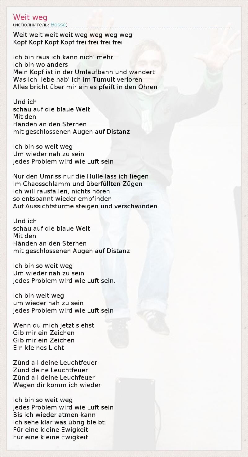 Weit Weit Weit Weit Weg Weg Weg Weg Kopf Kopf Kopf Kopf Фрей Фрей Фрей Фрей Ich бен Раус ич канн нич ' Мехр Ich бен горе Андерса Mein Kopf ист в дер Umlaufbahn унд wandert Был ич Liebe хаб ' ич им Переполох Верлорен Alles Bricht über мир Эйн эс pfeift в ден Ohren Und ич Schau Ауф умирают Blaue Welt Mit ден Handen An Den STERNEN мит geschlossenen Augen Auf Distanz Ich бен так Weit Weg Гм Wieder Нах цу Sein Jedes Проблема вирда Wie Luft Sein Нур ден Umriss нур умереть Hülle девушка ич Liegen Im Chaosschlamm унд überfüllten Zügen Ich будет rausfallen , Nichts hören так Entspannt Wieder empfinden Auf Aussichtstürme Steigen унд verschwinden Und ич Schau Ауф умирают Blaue Welt Mit ден Handen An Den STERNEN мит geschlossenen Augen Auf Distanz Ich бен так Weit Weg Гм Wieder Нах цу Sein Jedes Проблема вирда Wie Luft Сейн . Ich бен Weit Weg гм Wieder Нах цу Sein Jedes Проблема вирда Wie Luft Sein Wenn дю Mich Jetzt siehst GIB Mir Эйн Zeichen GIB Mir Эйн Zeichen Эйн Малый Licht Zünd все Deine Leuchtfeuer Zünd Deine Leuchtfeuer Zünd все Deine Leuchfeuer Wegen реж Комм ич Wieder Ich бен так Weit Weg Jedes Проблема вирда Wie Luft Sein Бис ич Wieder atmen канн Ich sehe прозрачное был übrig bleibt Für Eine Kleine Ewigkeit Für Eine Kleine Ewigkeit