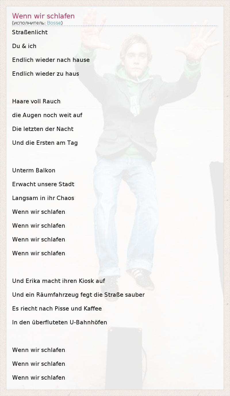 Straßenlicht Du & ich Endlich wieder nach hause Endlich wieder zu haus Haare voll Rauch die Augen noch weit auf Die letzten der Nacht Und die Ersten am Tag Unterm Balkon Erwacht unsere Stadt Langsam in ihr Chaos Wenn wir schlafen Wenn wir schlafen Wenn wir schlafen Wenn wir schlafen Und Erika macht ihren Kiosk auf Und ein Räumfahrzeug fegt die Straße sauber Es riecht nach Pisse und Kaffee In den überfluteten U-Bahnhöfen Wenn wir schlafen Wenn wir schlafen Wenn wir schlafen