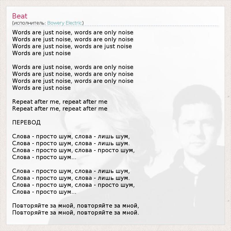 Words are just noise, words are only noise Words are just noise, words are only noise Words are just noise, words are just noise Words are just noise Words are just noise, words are only noise Words are just noise, words are only noise Words are just noise, words are only noise Words are just noise Repeat after me, repeat after me Repeat after me, repeat after me ПЕРЕВОД Слова - просто шум, слова - лишь шум, Слова - просто шум, слова - лишь шум. Слова - просто шум, слова - просто шум, Слова - просто шум... Слова - просто шум, слова - лишь шум, Слова - просто шум, слова - лишь шум. Слова - просто шум, слова - просто шум, Слова - просто шум... Повторяйте за мной, повторяйте за мной, Повторяйте за мной, повторяйте за мной.