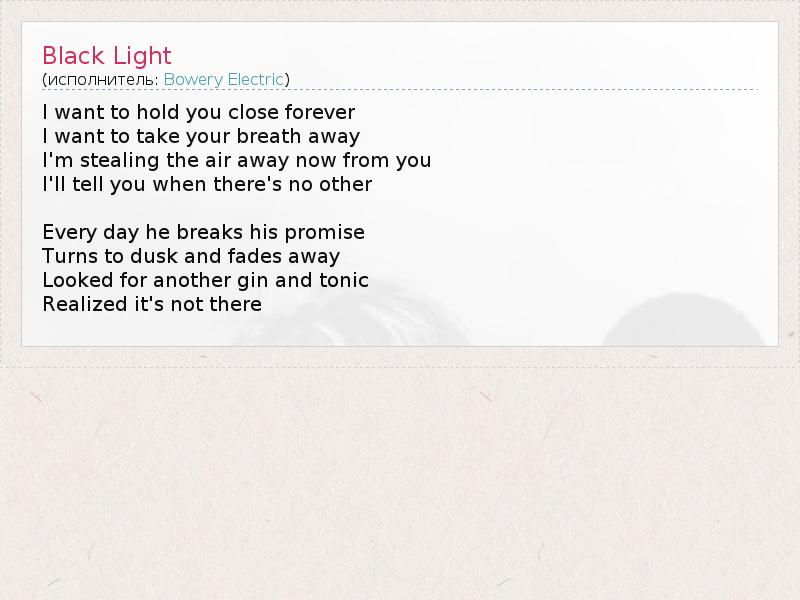 I want to hold you close forever I want to take your breath away I'm stealing the air away now from you I'll tell you when there's no other Every day he breaks his promise Turns to dusk and fades away Looked for another gin and tonic Realized it's not there