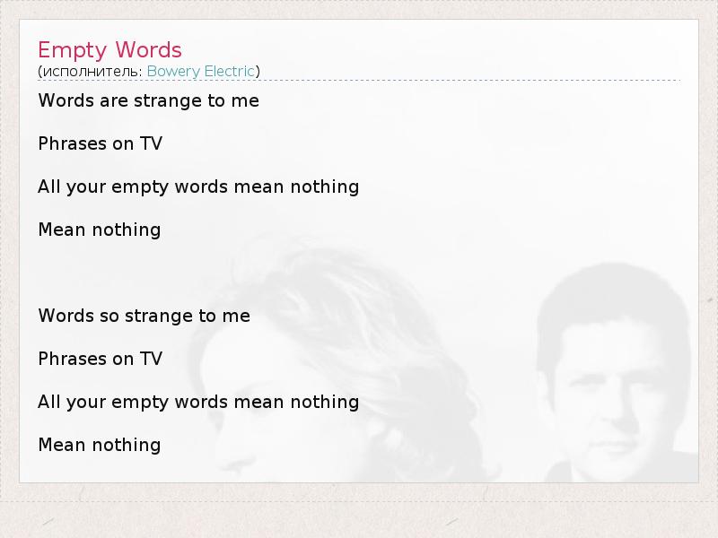 Words are strange to me Phrases on TV All your empty words mean nothing Mean nothing Words so strange to me Phrases on TV All your empty words mean nothing Mean nothing