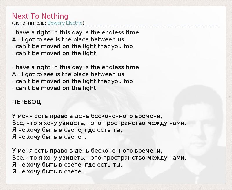 I have a right in this day is the endless time All I got to see is the place between us I can't be moved on the light that you too I can't be moved on the light I have a right in this day is the endless time All I got to see is the place between us I can't be moved on the light that you too I can't be moved on the light ПЕРЕВОД У меня есть право в день бесконечного времени, Все, что я хочу увидеть, - это пространство между нами. Я не хочу быть в свете, где есть ты, Я не хочу быть в свете... У меня есть право в день бесконечного времени, Все, что я хочу увидеть, - это пространство между нами. Я не хочу быть в свете, где есть ты, Я не хочу быть в свете...