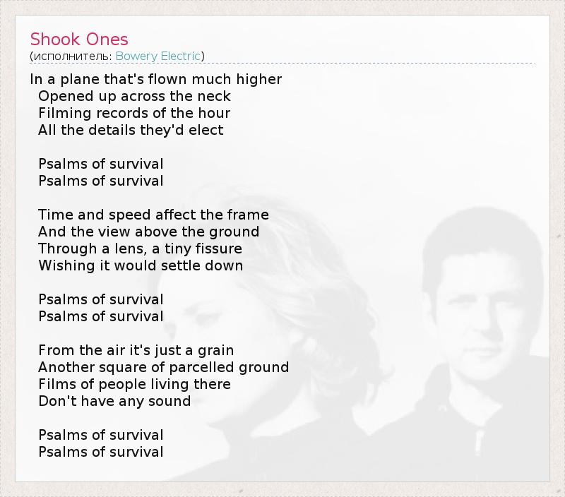 In a plane that's flown much higher Opened up across the neck Filming records of the hour All the details they'd elect Psalms of survival Psalms of survival Time and speed affect the frame And the view above the ground Through a lens, a tiny fissure Wishing it would settle down Psalms of survival Psalms of survival From the air it's just a grain Another square of parcelled ground Films of people living there Don't have any sound Psalms of survival Psalms of survival