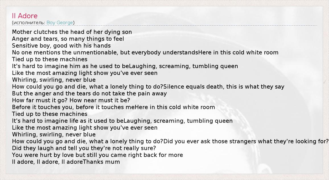 Это интересно:Бой Джорджа никогда не забывали. Хотя последний альбом Cheapness And Beauty, он выпустил после семилетнего перерыва. Смены его фантастического имиджа и оглушительные скандалы, сопровождавшие его карьеру, приковывали внимание публики к его персоне почище музыкальных достижений. К тому же недавно он опубликовал свою предельно откровенную автобиографию Take It Like A Man. С ее помощью Андрей БУХАРИН... продолжение