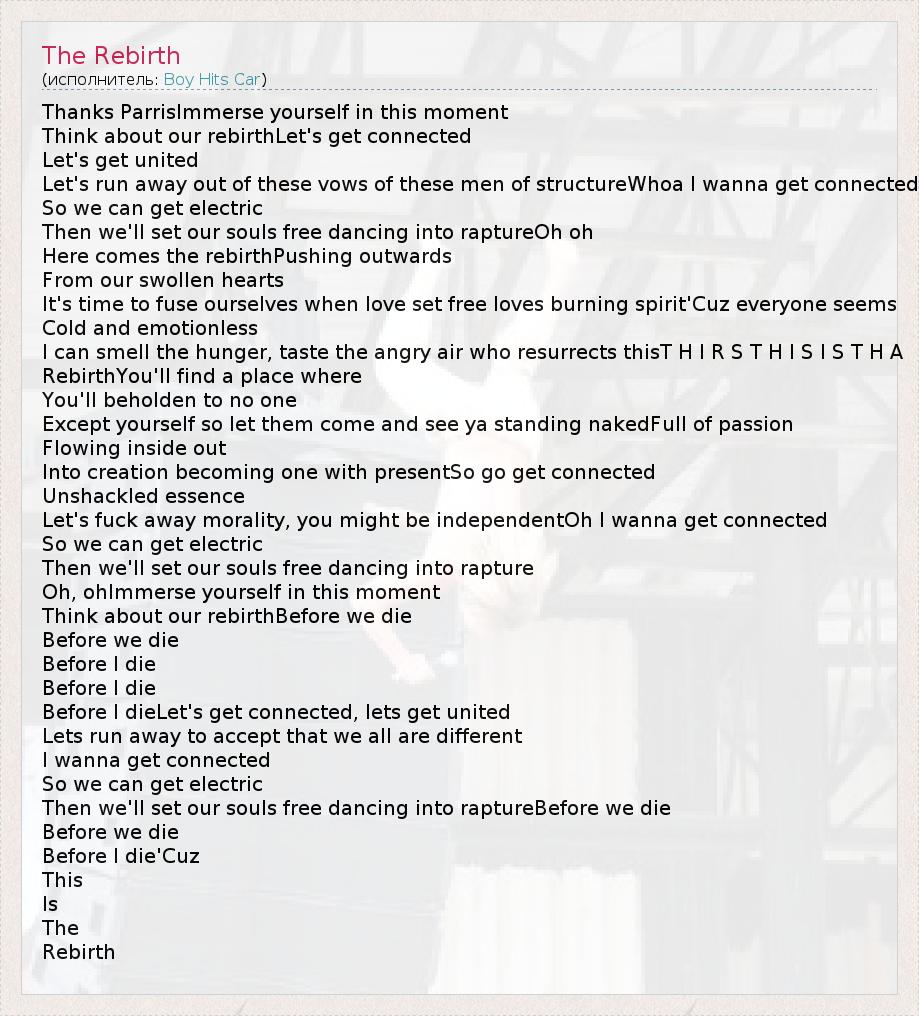 Thanks ParrisImmerse yourself in this moment Think about our rebirthLet's get connected Let's get united Let's run away out of these vows of these men of structureWhoa I wanna get connected So we can get electric Then we'll set our souls free dancing into raptureOh oh Here comes the rebirthPushing outwards From our swollen hearts It's time to fuse ourselves when love set free loves burning spirit'Cuz everyone seems Cold and emotionless I can smell the hunger, taste the angry air who resurrects thisT H I R S T H I S I S T H A RebirthYou'll find a place where You'll beholden to no one Except yourself so let them come and see ya standing nakedFull of passion Flowing inside out Into creation becoming one with presentSo go get connected Unshackled essence Let's fuck away morality, you might be independentOh I wanna get connected So we can get electric Then we'll set our souls free dancing into rapture Oh, ohImmerse yourself in this moment Think about our rebirthBefore we die Before we die Before I die Before I die Before I dieLet's get connected, lets get united Lets run away to accept that we all are different I wanna get connected So we can get electric Then we'll set our souls free dancing into raptureBefore we die Before we die Before I die'Cuz This Is The Rebirth