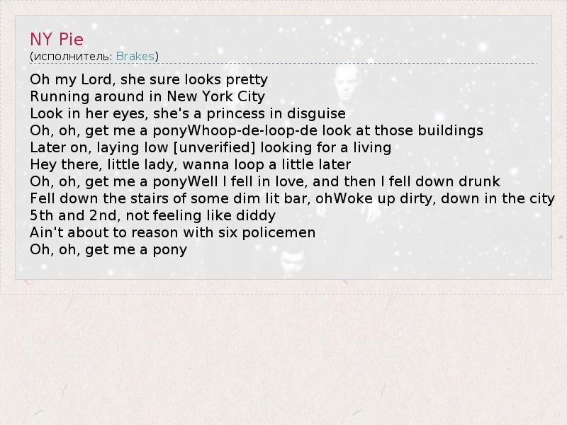 Oh my Lord, she sure looks pretty Running around in New York City Look in her eyes, she's a princess in disguise Oh, oh, get me a ponyWhoop-de-loop-de look at those buildings Later on, laying low [unverified] looking for a living Hey there, little lady, wanna loop a little later Oh, oh, get me a ponyWell I fell in love, and then I fell down drunk Fell down the stairs of some dim lit bar, ohWoke up dirty, down in the city 5th and 2nd, not feeling like diddy Ain't about to reason with six policemen Oh, oh, get me a pony